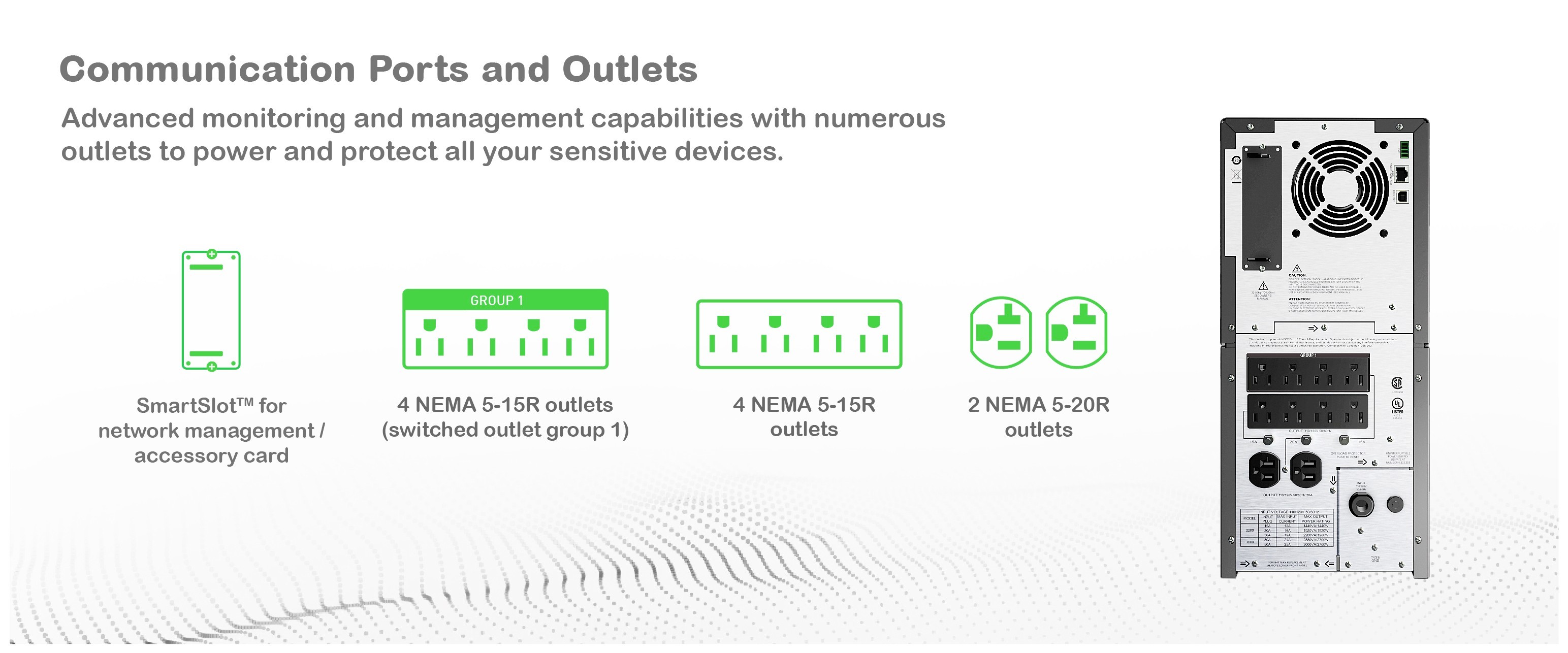 8 NEMA 5-15R and 2 NEMA 5-20R outlets, including 1 switched outlet group.