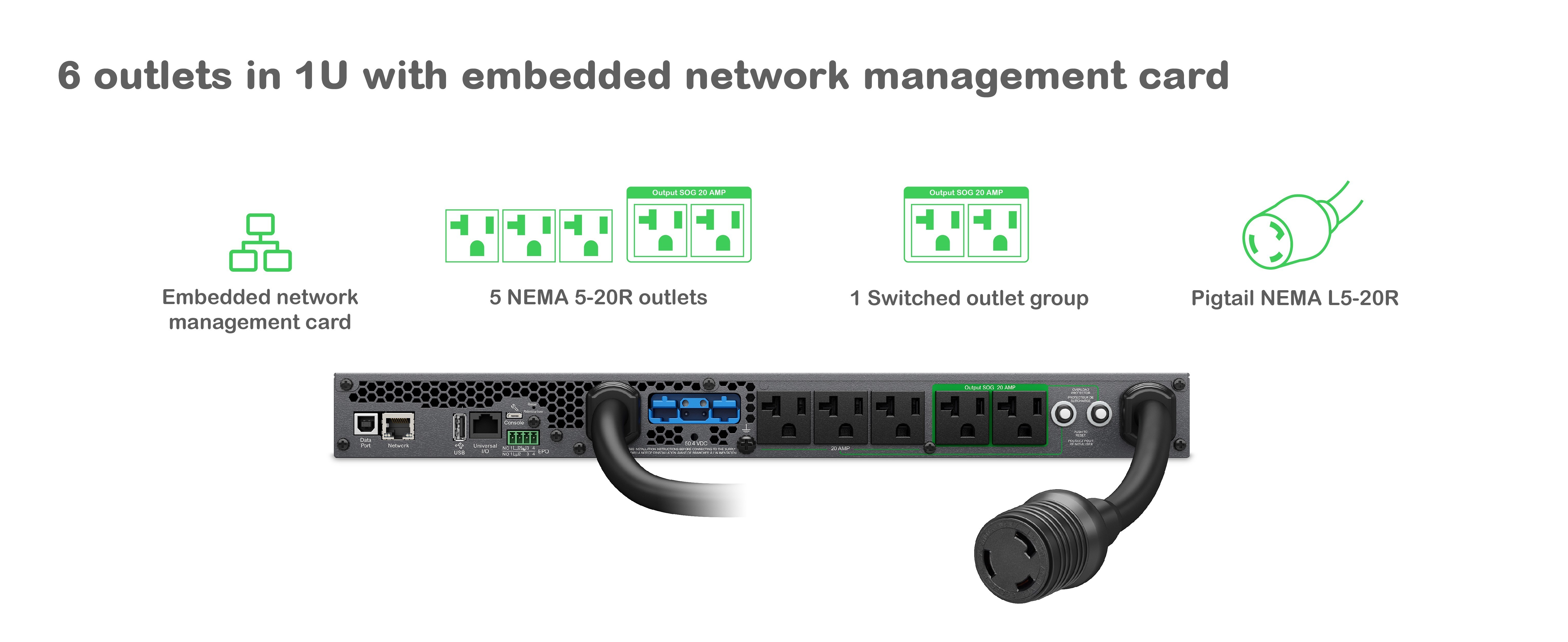 5 NEMA 5-20R outlets, 1 pigtail NEMA L5-20R, and a switched outlet group