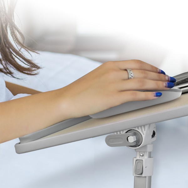 The table surface is designed to be adjustable from the side using a quick-release latch. Simply flip the quick release to tilt the table to the comfortable position you desire.