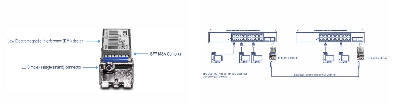 Transmit: 1310nm / Receive: 1550nm, pair with TEG-MGBS40D5 or compatible SFP module