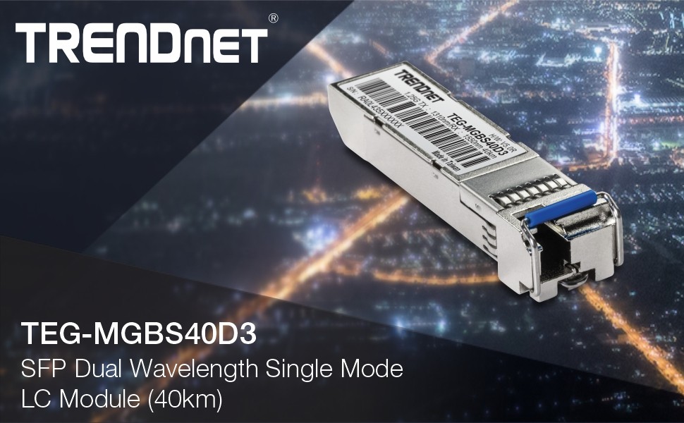 TRENDnet’s SFP Dual Wavelength Single Mode LC Modules are compatible with standard SFP slots found on network switches and fiber converters. Each single mode BiDi SFP transceiver is equipped with a simplex LC fiber connection interface, and supports high-speed data rates up to 1.25Gbps. All TRENDnet SFP fiber modules support connections for reliable, long-distance network applications.