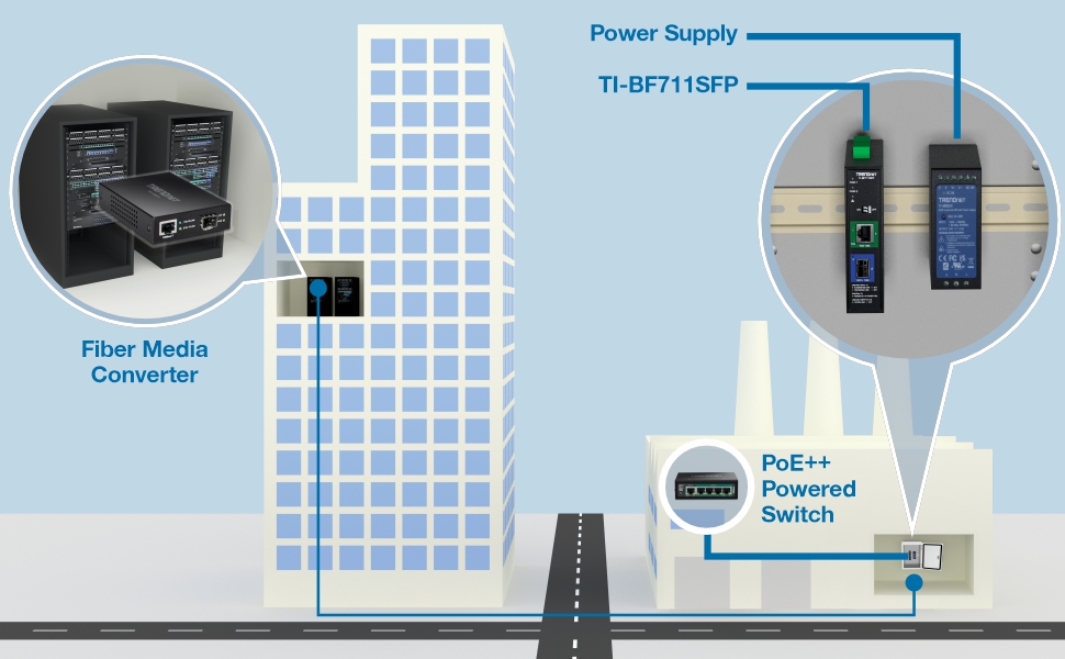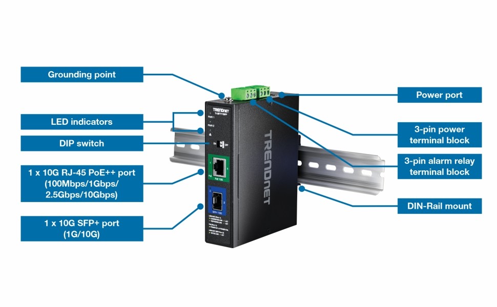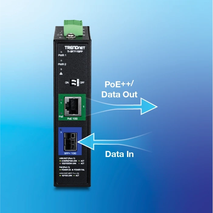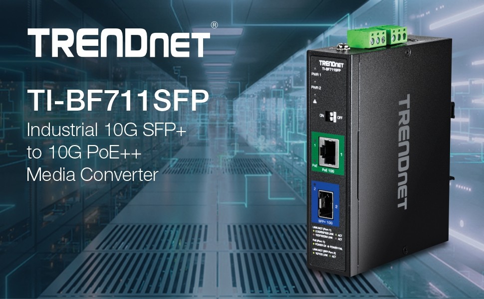 TRENDnet’s Industrial 10G SFP+ to 10G PoE++ Media Converter, model TI-BF711SFP, converts a long-distance fiber connection to a copper connection, while providing power to PoE, PoE+, and PoE++ compliant devices, such as IP cameras, VoIP phones, and wireless access points. With an operating temperature range of -40°– 75° C (-40° – 167° F), the industrial PoE++ media converter features a hardened IP50 rated metal housing suitable for tough, industrial environments. The industrial PoE++ media converter’s rugged design also provides protection from shock, freefall, and vibration.