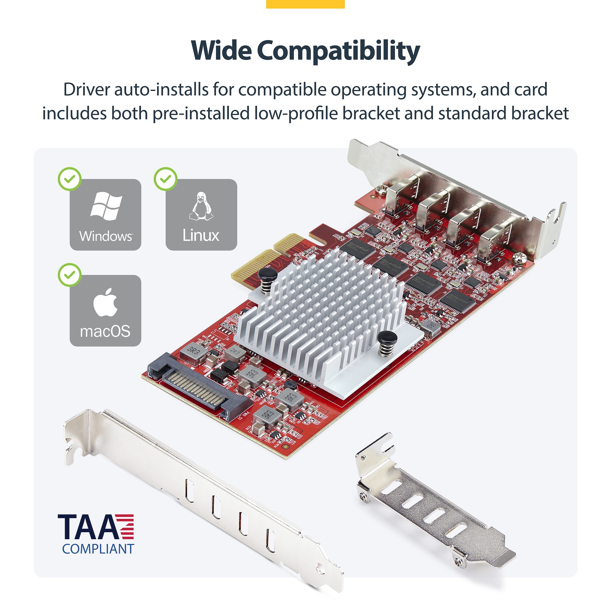 The PCI Express USB card is plug-and-play in most major operating systems, including Windows, macOS, and Linux. The card is compatible with PCI Express 3.0 and x4, x8, and x16 slots. The USB expansion card also ships with a pre-installed low-profile bracket and includes a standard profile bracket for maximum compatibility.