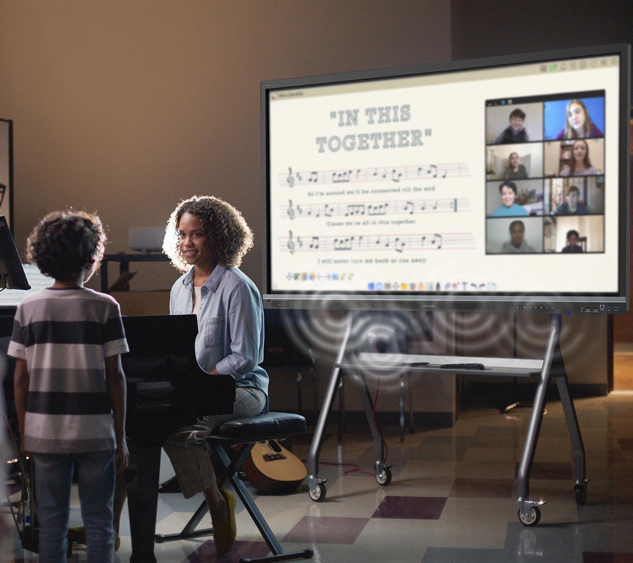 A powerful 70W front-facing soundbar with a built-in subwoofer ensures crystal-clear sound throughout the classroom. The integrated beamforming microphone array with noise cancellation captures voices from up to 8 meters away, making it ideal for remote teaching and lesson recordings.