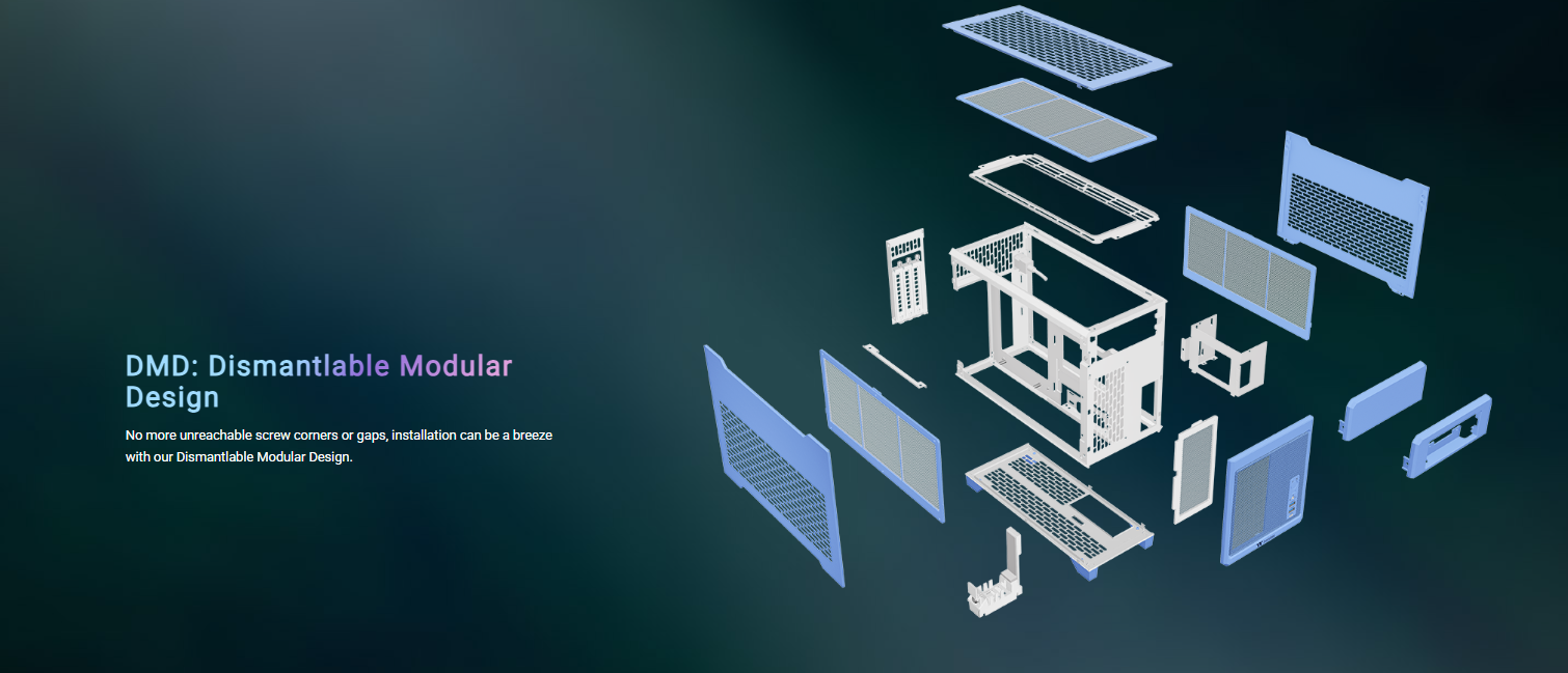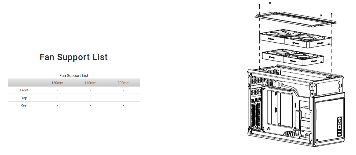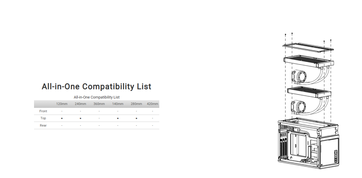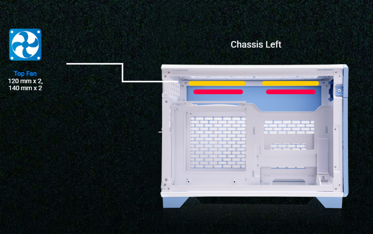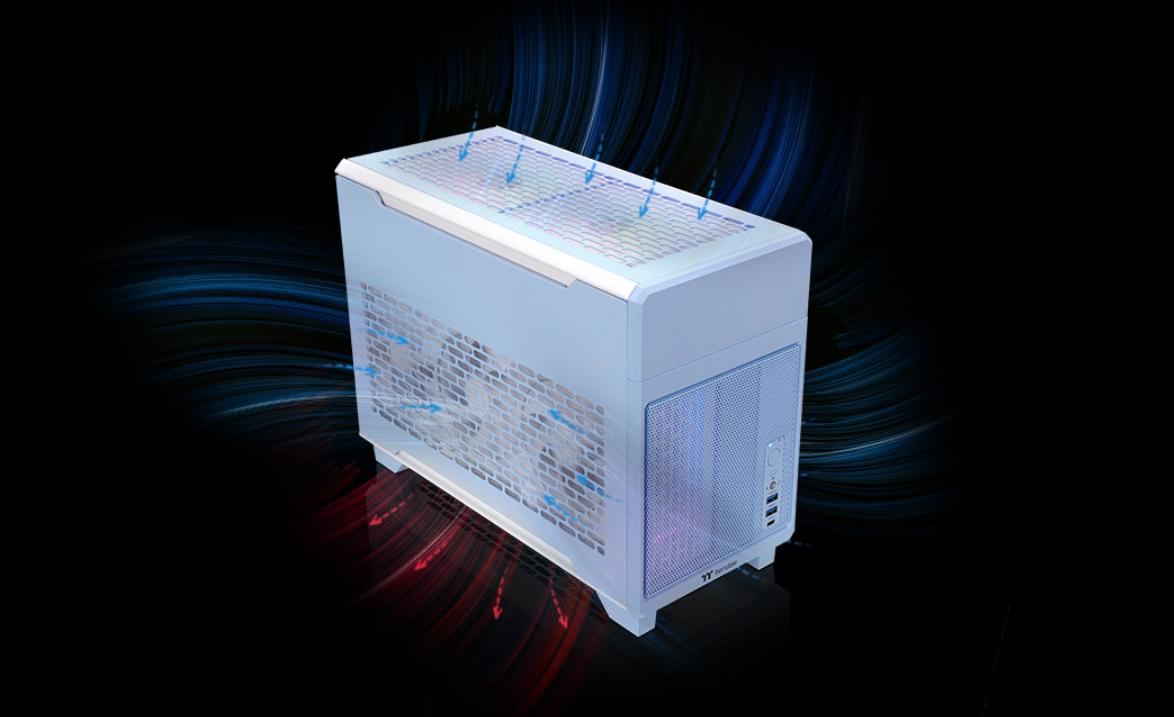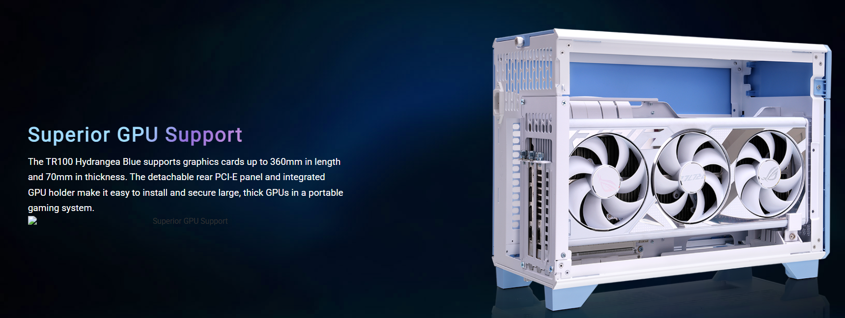 Despite its compact footprint, The TR100 Hydrangea Blue still has good hardware support. It can support a CPU cooler with a maximum height of 68mm, a GPU with a maximum length of 360mm (and up to 70mm in width), a power supply with a length of up to 130mm, and two 2.5" SSDs. For cooling support, up to two 120mm/140mm fans or a 280mm all-in-one CPU cooler can be placed on top of the chassis for effective cooling.