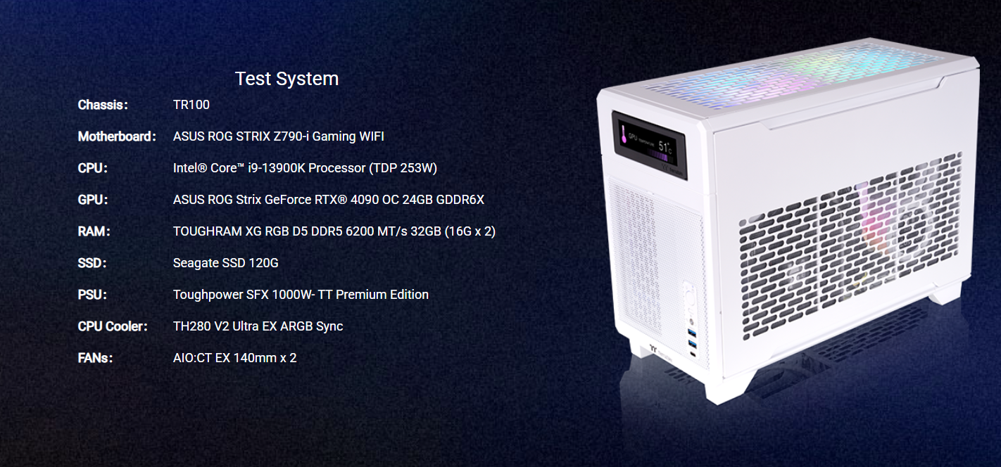 At Thermaltake, we always stress test our products under harsh conditions to ensure product quality. The TR100 Hydrangea Blue products were tested at 100% full load for 30 minutes, with the most high-end CPU, GPU, and motherboard at the time of test, while paring with a consumer-style setup, allowing us to test how the chassis performs under real-world situations.
