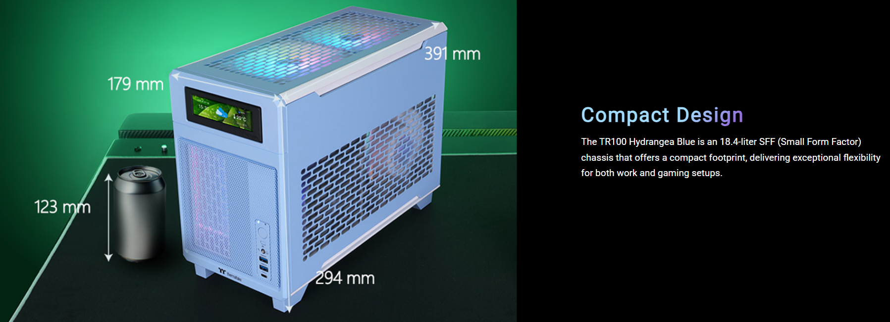 The TR100 Hydrangea Blue Mini Tower Chassis is a compact, dual-chamber, Mini-ITX case that is designed for those who demand performance and portability. The dual-chamber design positions the mini-ITX motherboard and SFX PSU in the right chamber, with the graphics card in the left, connected via a PCIe 4.0 riser cable. It supports two 120mm/140mm top fans and up to a 280mm AIO for cooling, plus two 2.5” SSDs, one in each chamber. All panels are removable and well-ventilated for optimal cooling and an easier build. To make it more visual appealing, a separately sold 3.9" LCD Screen Kit is also an option. Additionally, the separately sold suitcase allows users to carry the PC case and a complete gaming setup with them!