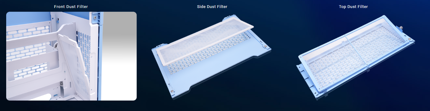 There are filters at the top, front and side of the chassis to protect the system from dust.