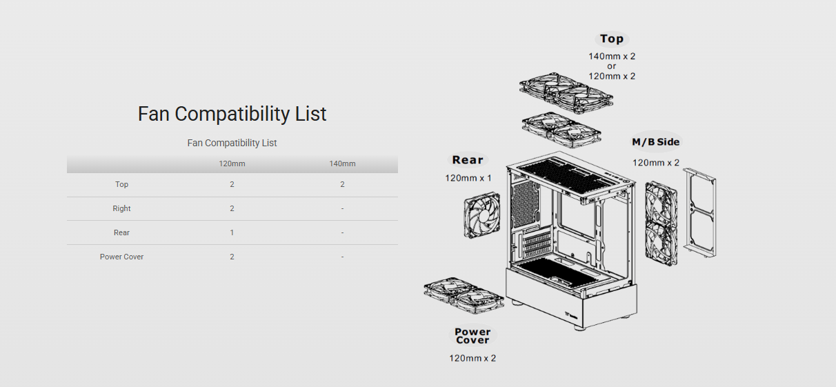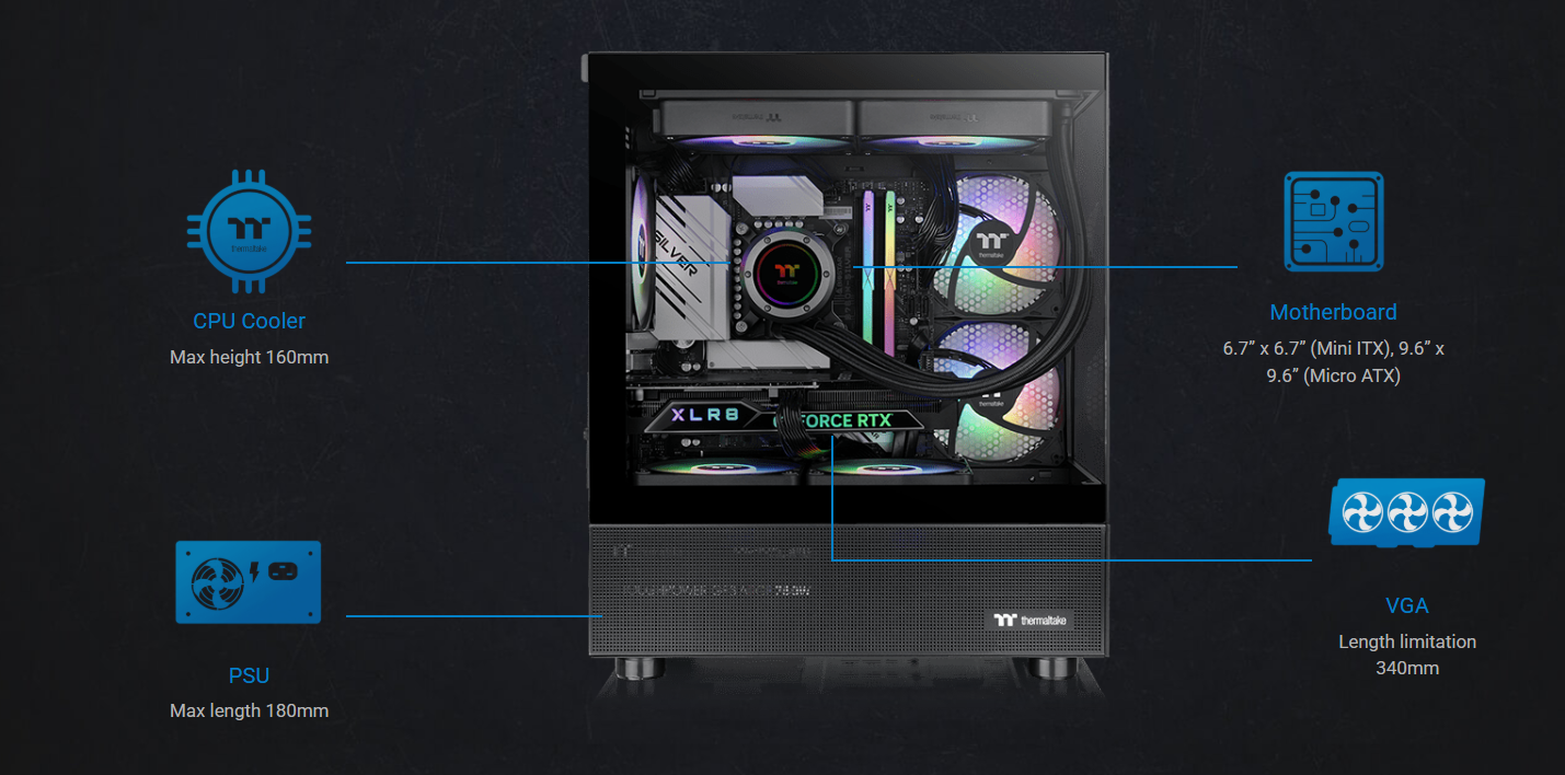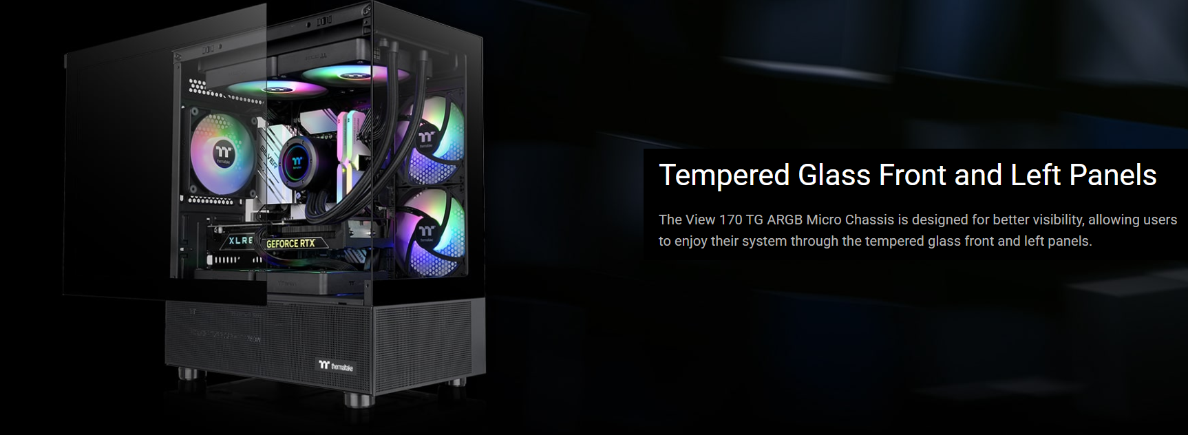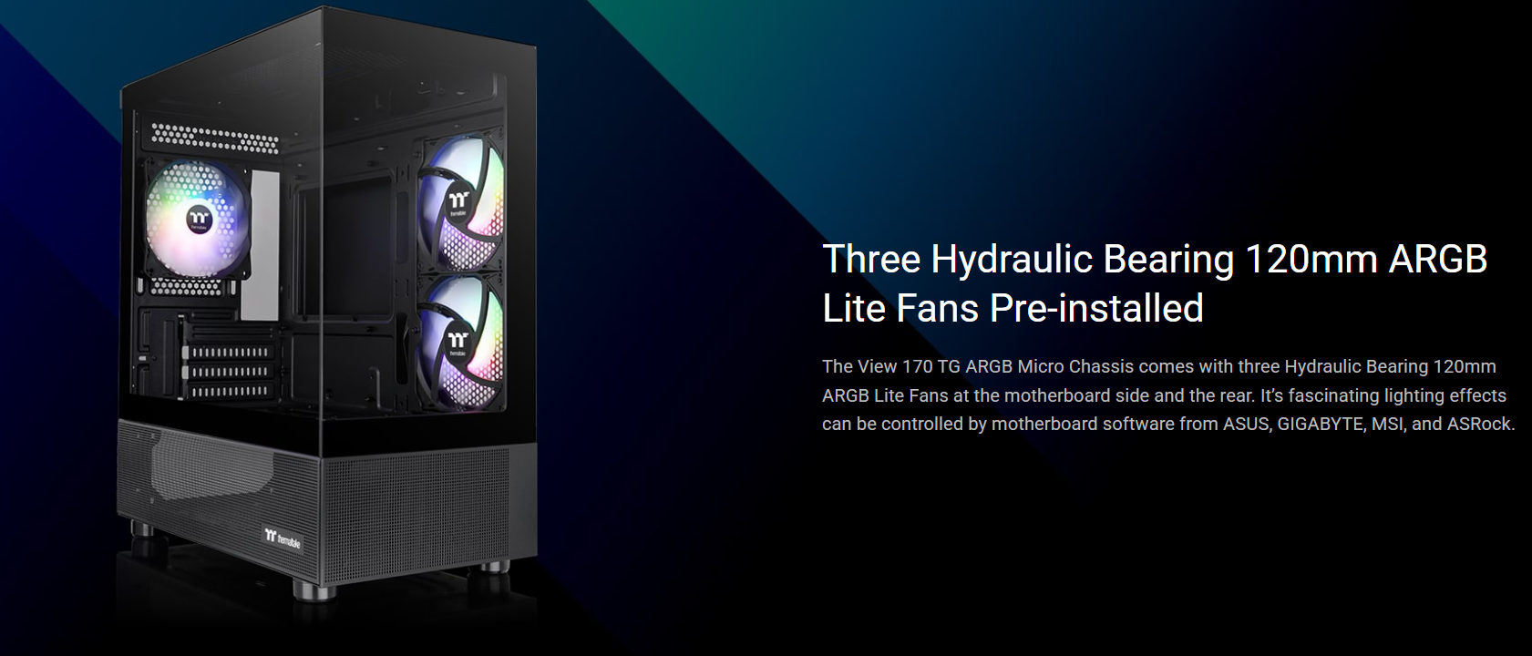 The View 170 TG ARGB Micro Chassis offers good expandability. It can support a CPU cooler with a maximum height of 160mm, VGA placement up to 340mm in length, a power supply up to 180mm in length. Optimized for excellent cooling performance, the case comes with three Hydraulic Bearing 120mm ARGB Lite Fans, and up to seven 120mm fans can be installed. For radiator compatibility, it can support up to a 280mm/240mm on top, giving more options for high-end expansion!