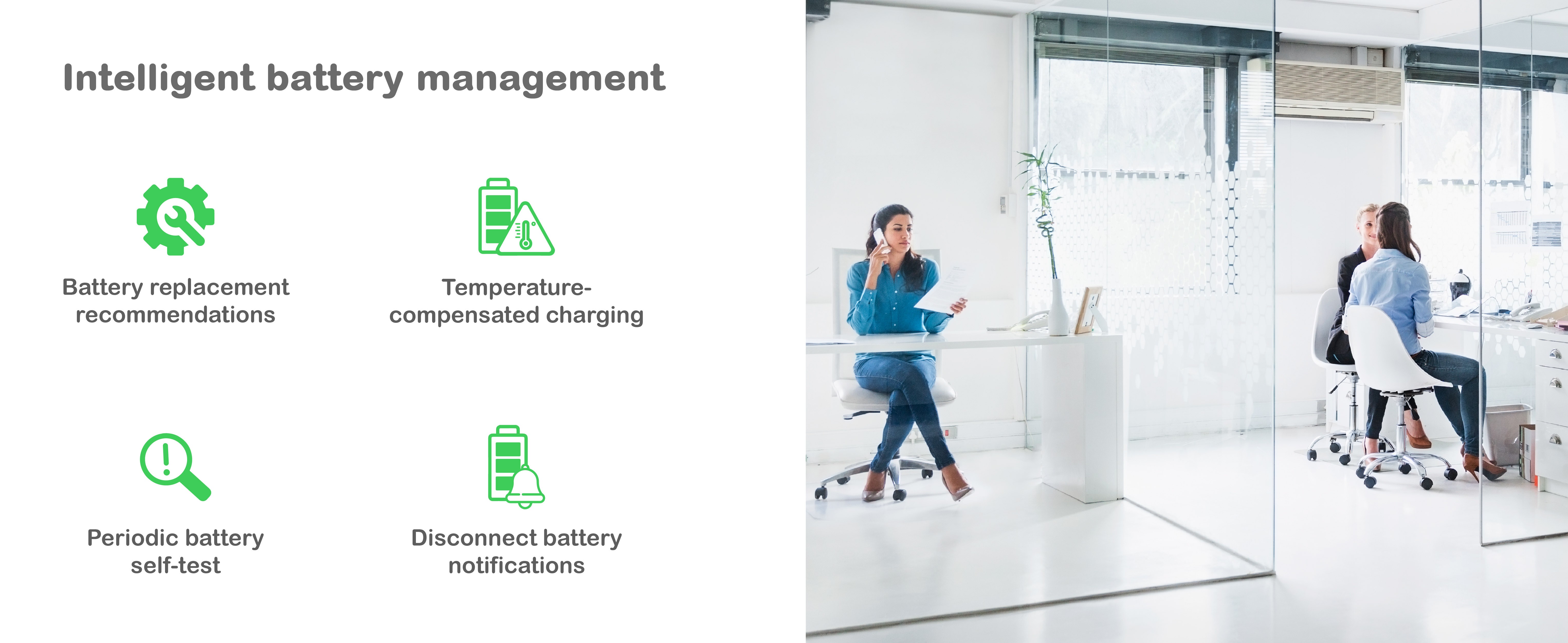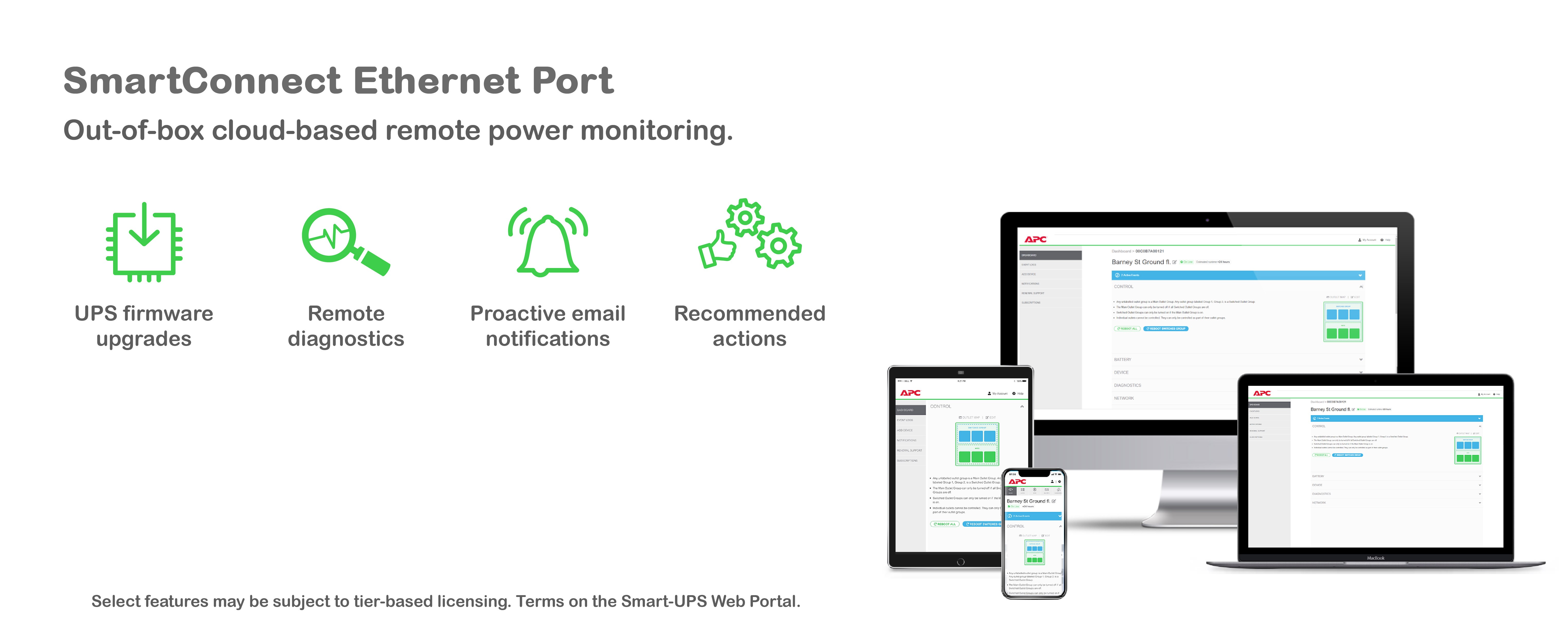 All new devices are on-boarded to the Standard plan with remote power monitoring, UPS and power events, automated distribution of firmware to UPSs with one-click remote installation and downloadable asset and renewal reports. Advanced Plan option provides UPS Outlet Group reboot for remote power cycling of connected IT equipment. Features vary with terms of use.