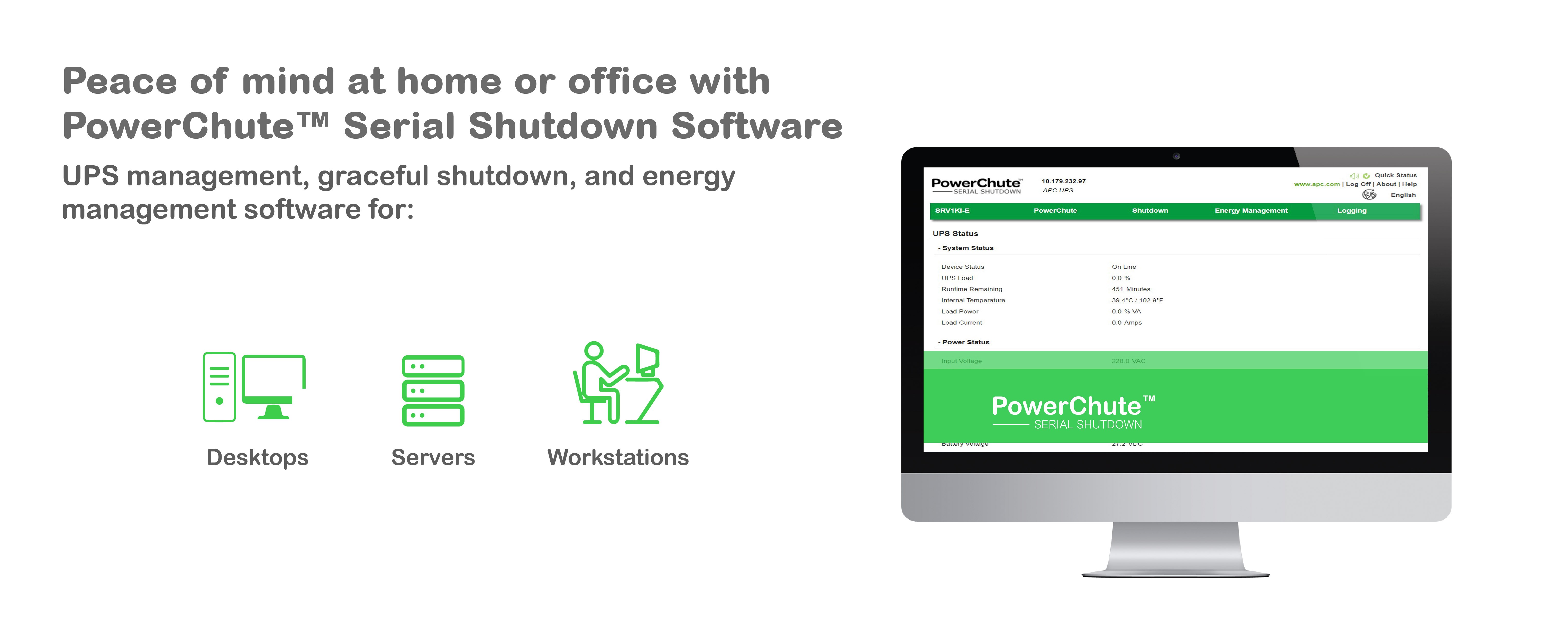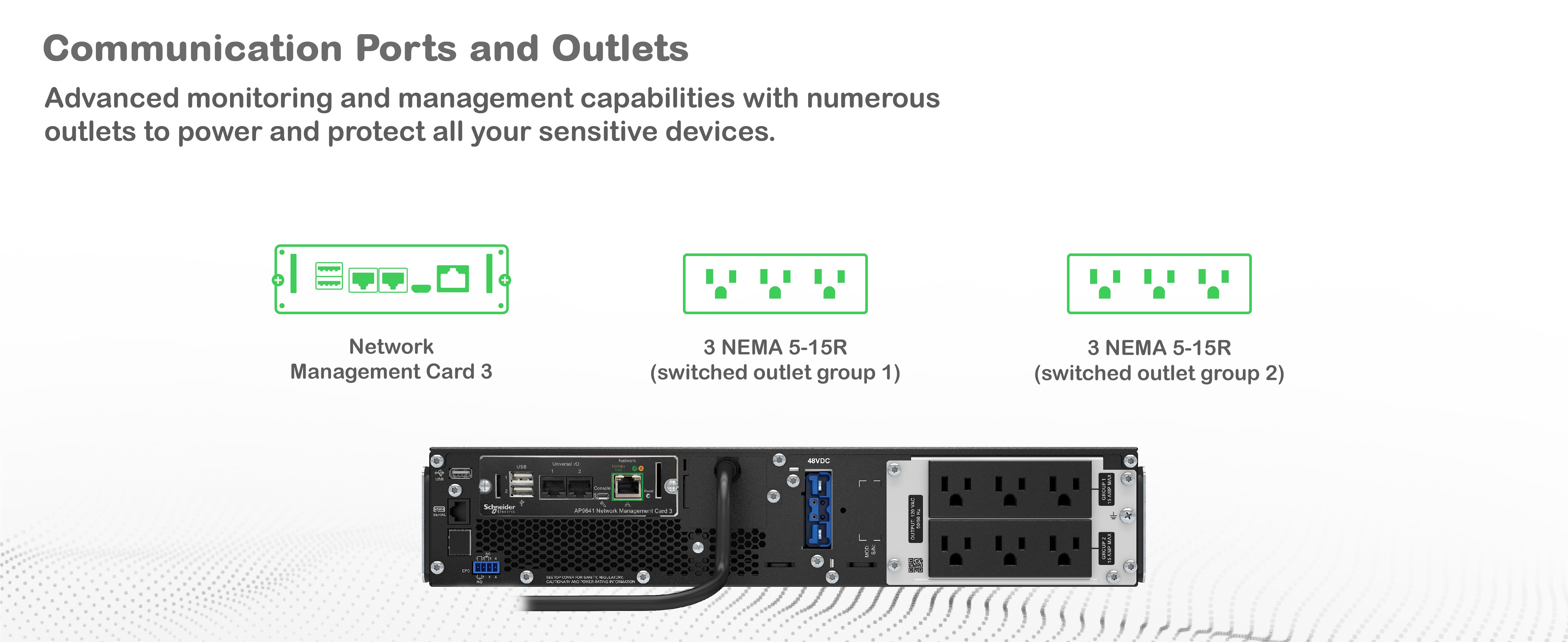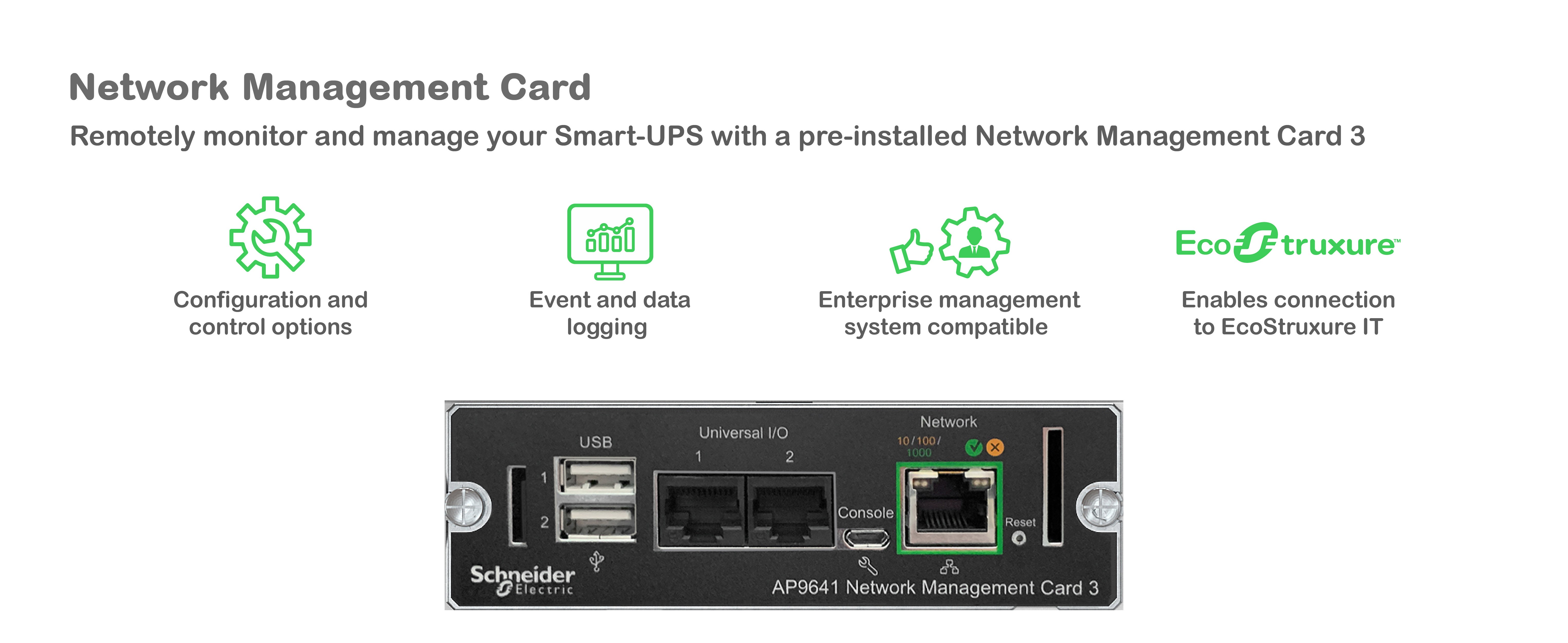 Options for monitoring and managing your UPS include EcoStruxure IT, Network Management Card, and PowerChute™ Network Shutdown Software.