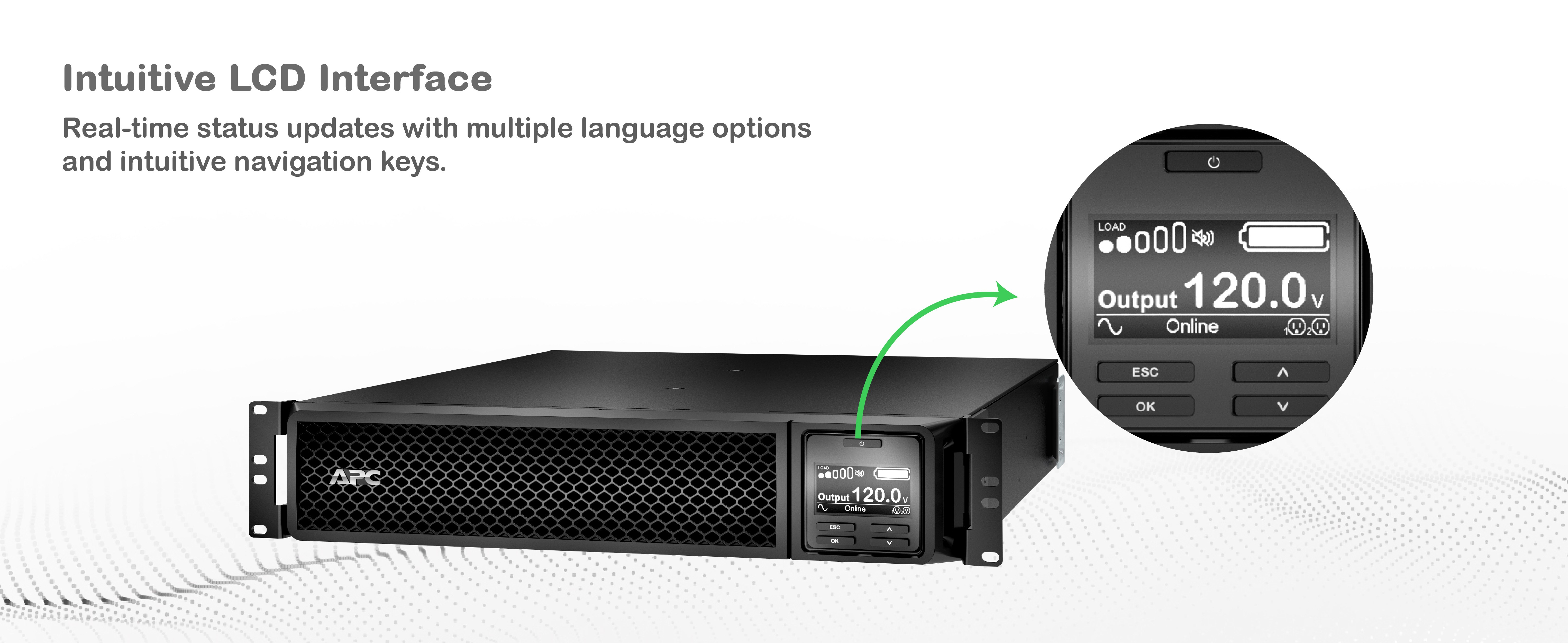Graphical LCD display Quick, easy-to-read, intuitive LCD provides information about the utility and UPS conditions. |