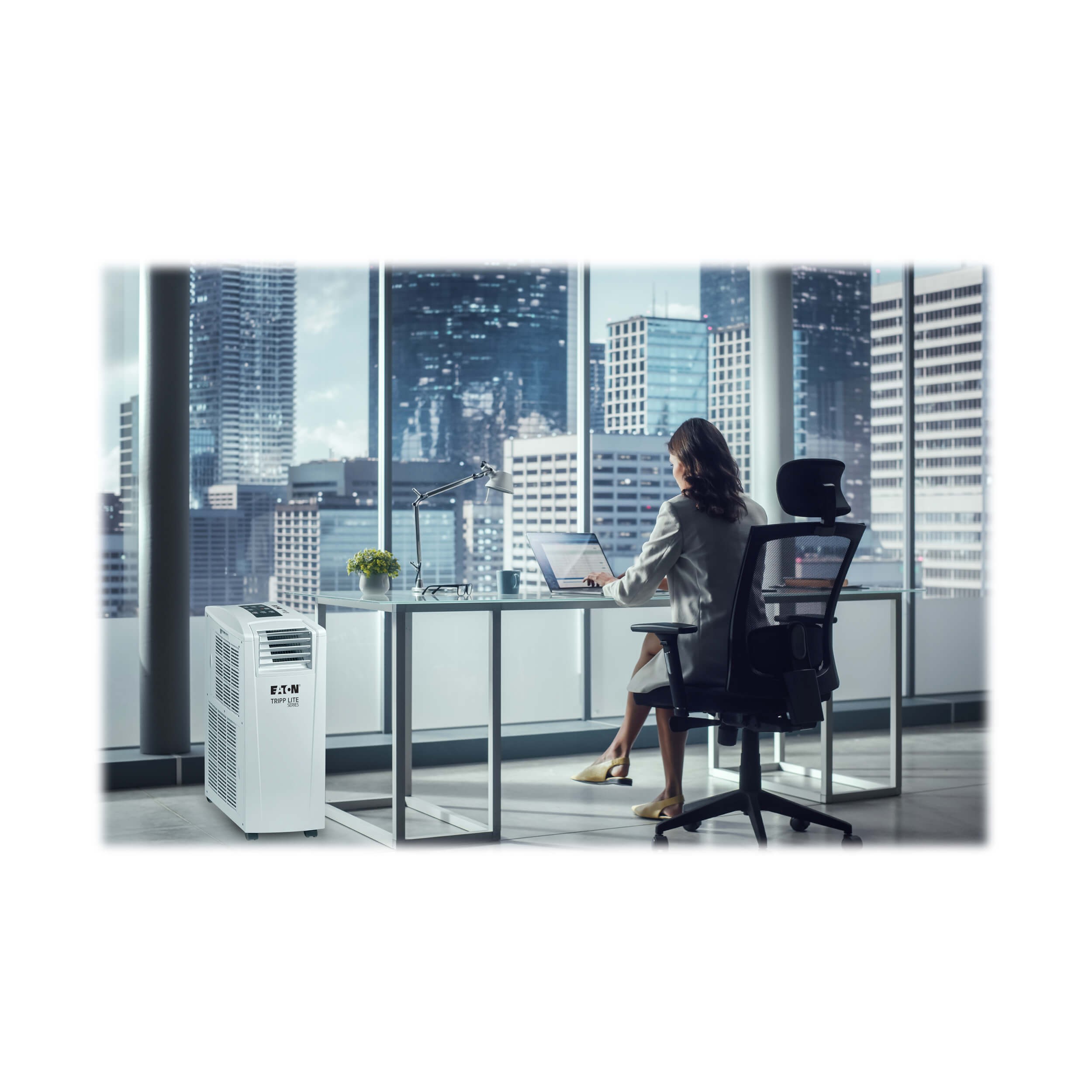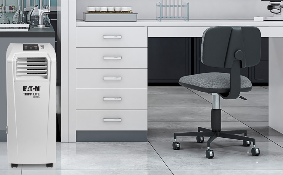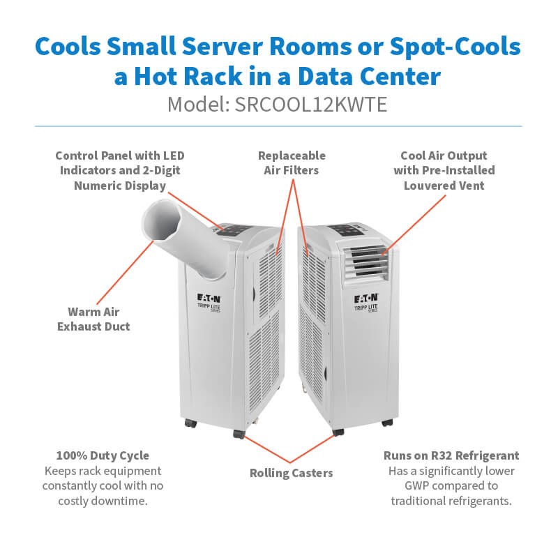 The Eaton Tripp Lite series SRCOOL12KWTE is a portable, compact, self-contained air conditioning unit designed for cooling overheated rack enclosures, IT-equipment hot spots and network closets without access to facility air conditioning. It can focus cool air through its flexible cooling duct or cool a small room through its louvered vent. It also filters and dehumidifies air to improve operating conditions and equipment reliability.