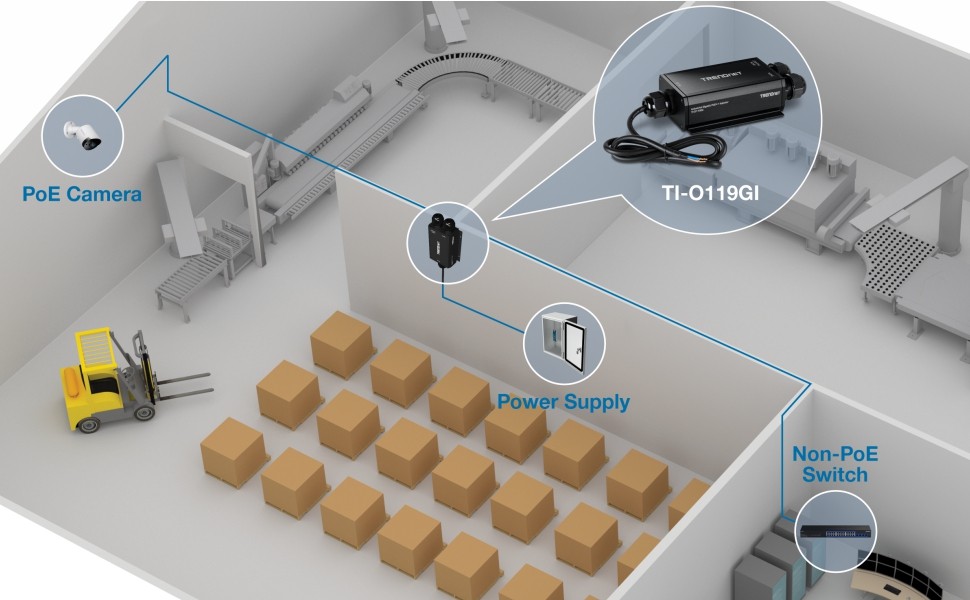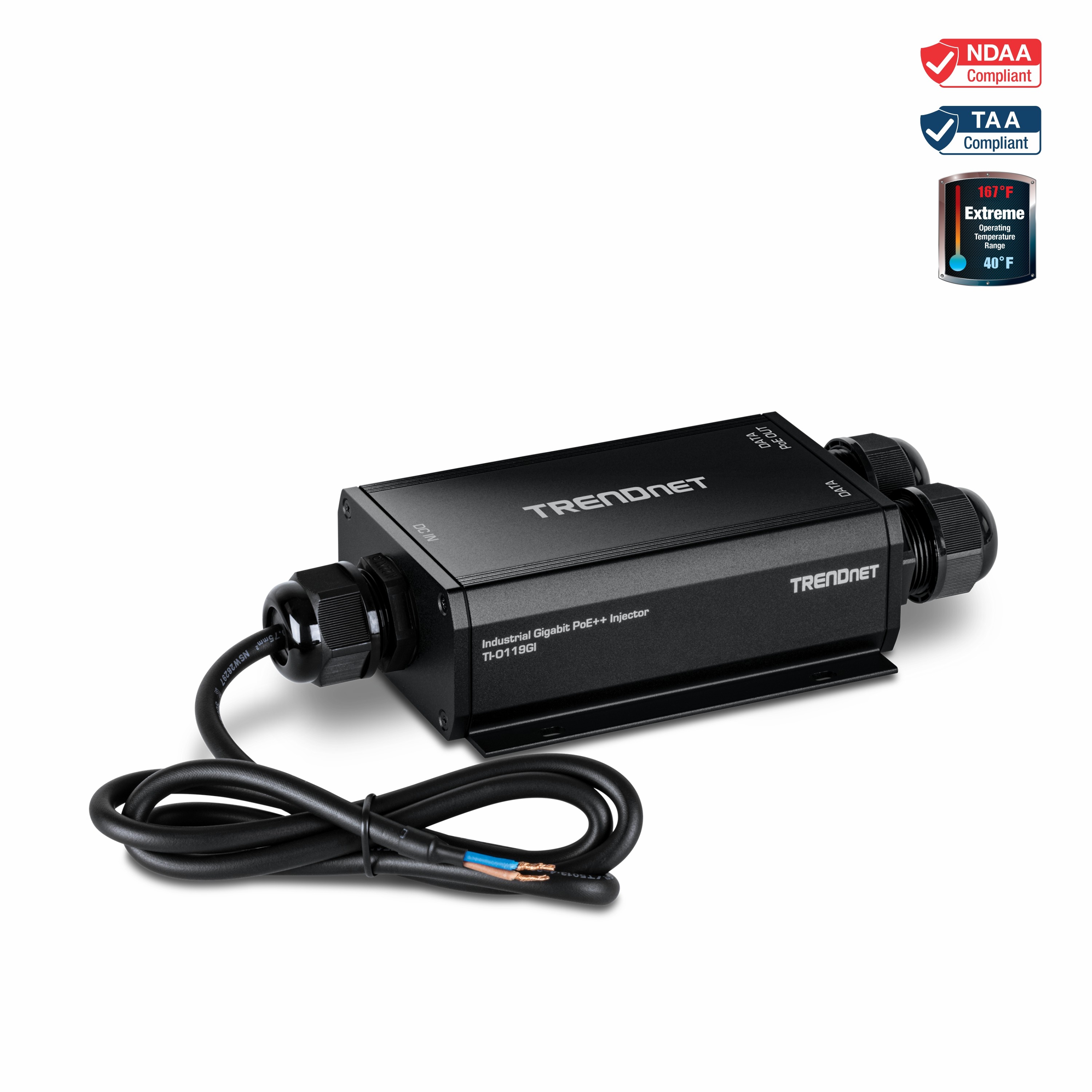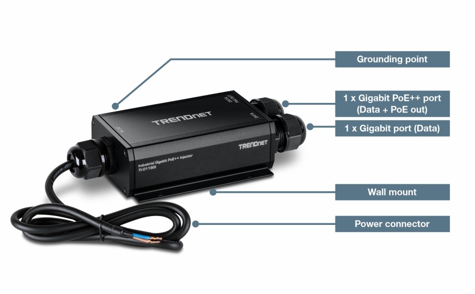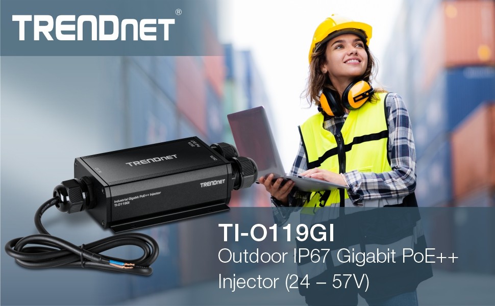 TRENDnet’s Outdoor IP67 Gigabit PoE++ Injector, model TI-O119GI, is an 802.3bt PoE++ injector that combines electrical power with a gigabit network connection to produce a high-powered 95W PoE++ network signal. Auto-sensing technology conveniently delivers the correct wattage needed to power your PoE, PoE+, and PoE++ device. Connect the outdoor PoE++ injector to a non-PoE switch and then run an Ethernet cable with data + power to network a PoE device up to 100 meters (328 ft.) away. The outdoor PoE++ injector is equipped with an IP67 outdoor rated metal enclosure, designed to withstand a high degree of vibration and shock, while operating within an extreme temperature range of -40° – 75° C (-40° – 167° F) for outdoor environments.