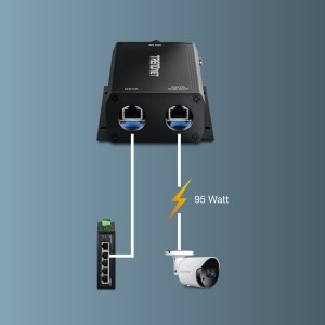 This outdoor PoE++ injector supplies up to 95W of power to one PoE (IEEE 802.3af), PoE+ (IEEE 802.3at), or PoE++ (IEEE 802.3bt) device.