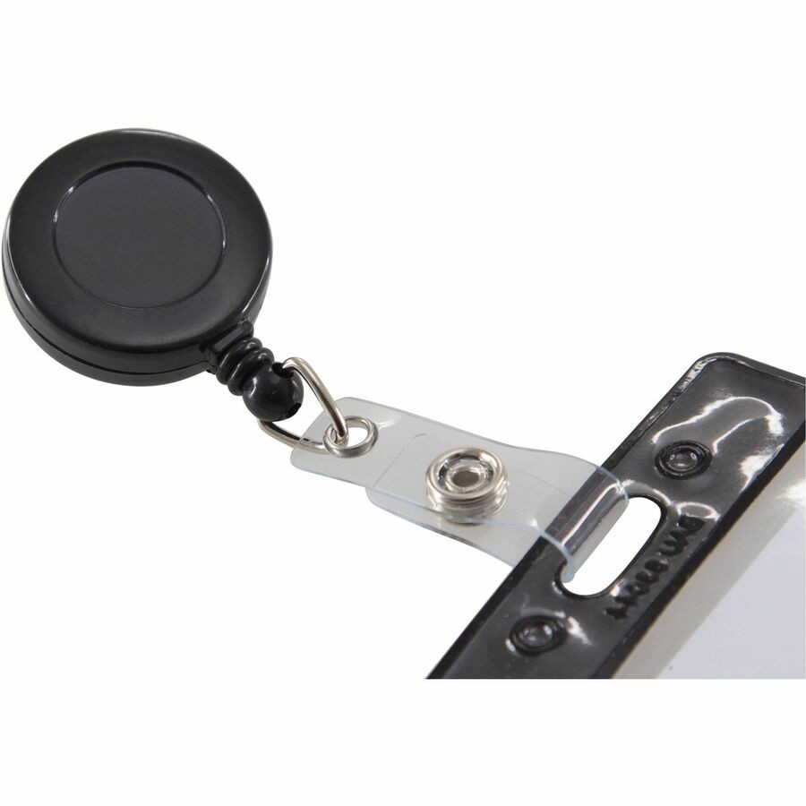 Card reel extends 30" for convenient scanning or swiping of card and then automatically retracts. Easily attaches to most any article of clothing. Simply pull the card reel out to show your badge to security.