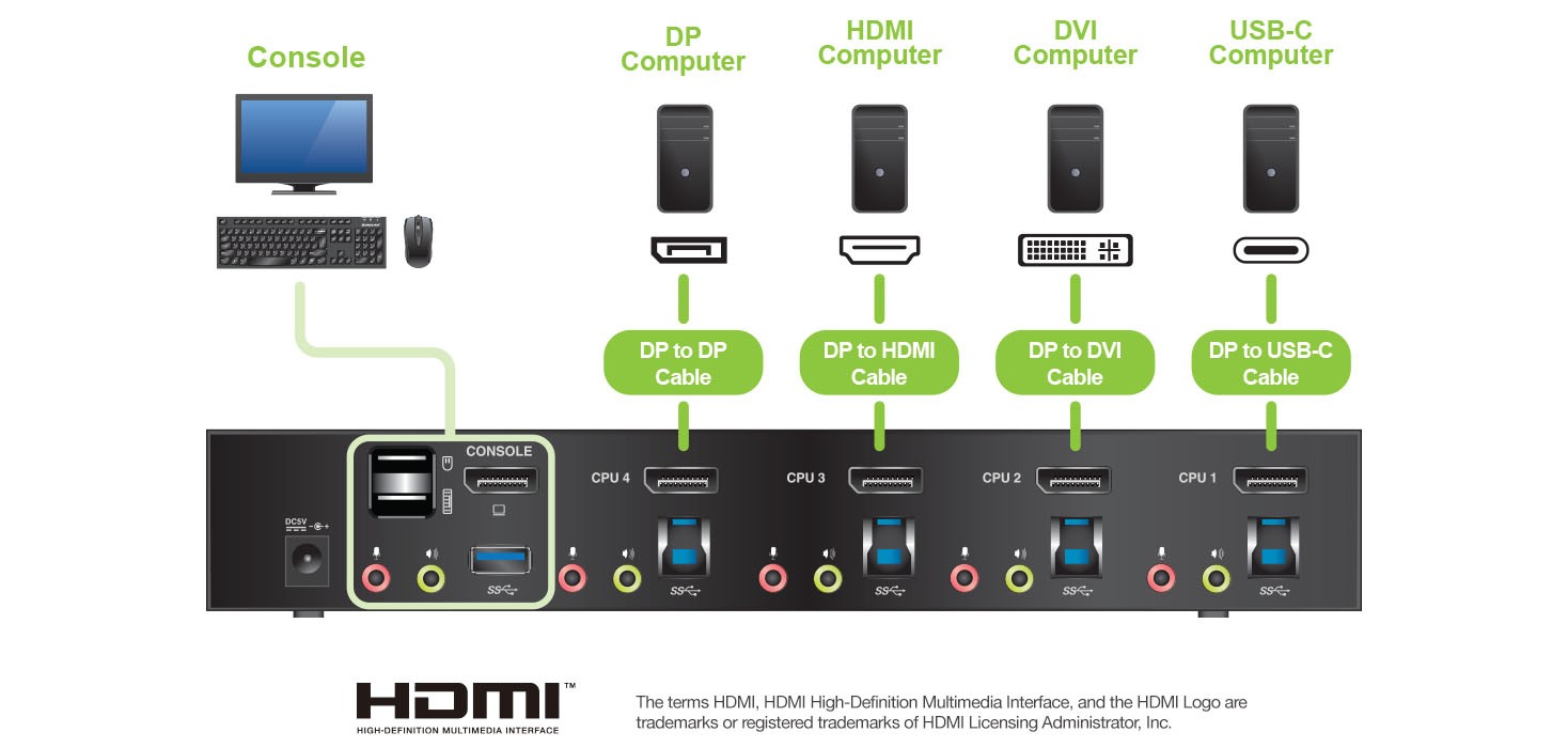 Connect multiple to multiple port configurations with IOGEAR Universal KVM cables* enabling IT administrators' options for preventing compatibility issues with diverse secure computer ecosystem. The universal KVM cables connect multiple video sources to a IOGEAR KVM even if they are using different display standards. This flexibility enables IT managers to deploy the same KVM switch across their network without the need for unreliable active cables or costly external video converters or additional docking stations. The universal cables options include HDMI® to DisplayPort, DVI to DisplayPort and USB Type-C ™ to DisplayPort.