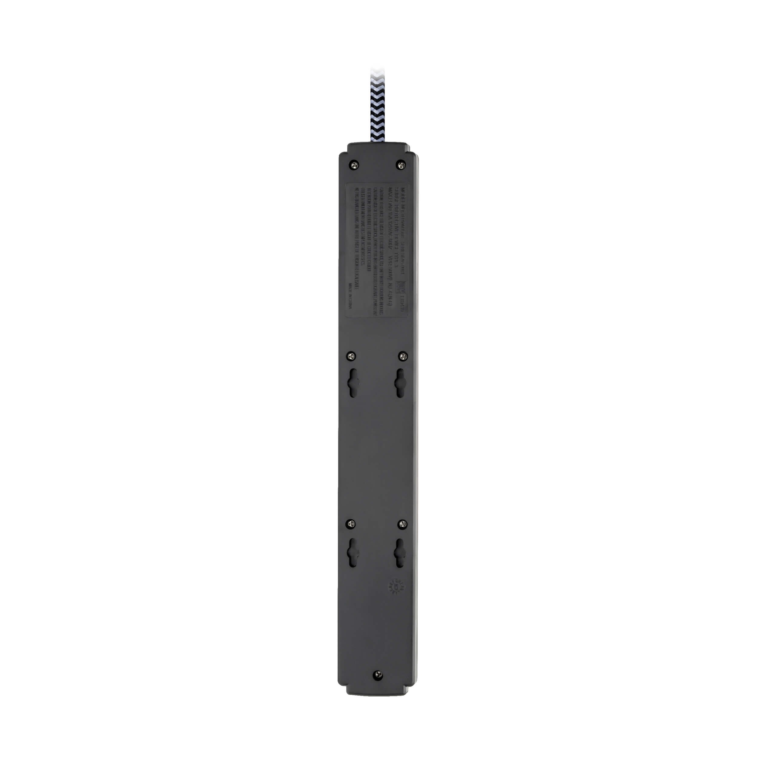 This surge protector has keyhole slots incorporated into the bottom panel provide convenient wall or desk mounting options for the black plastic housing.