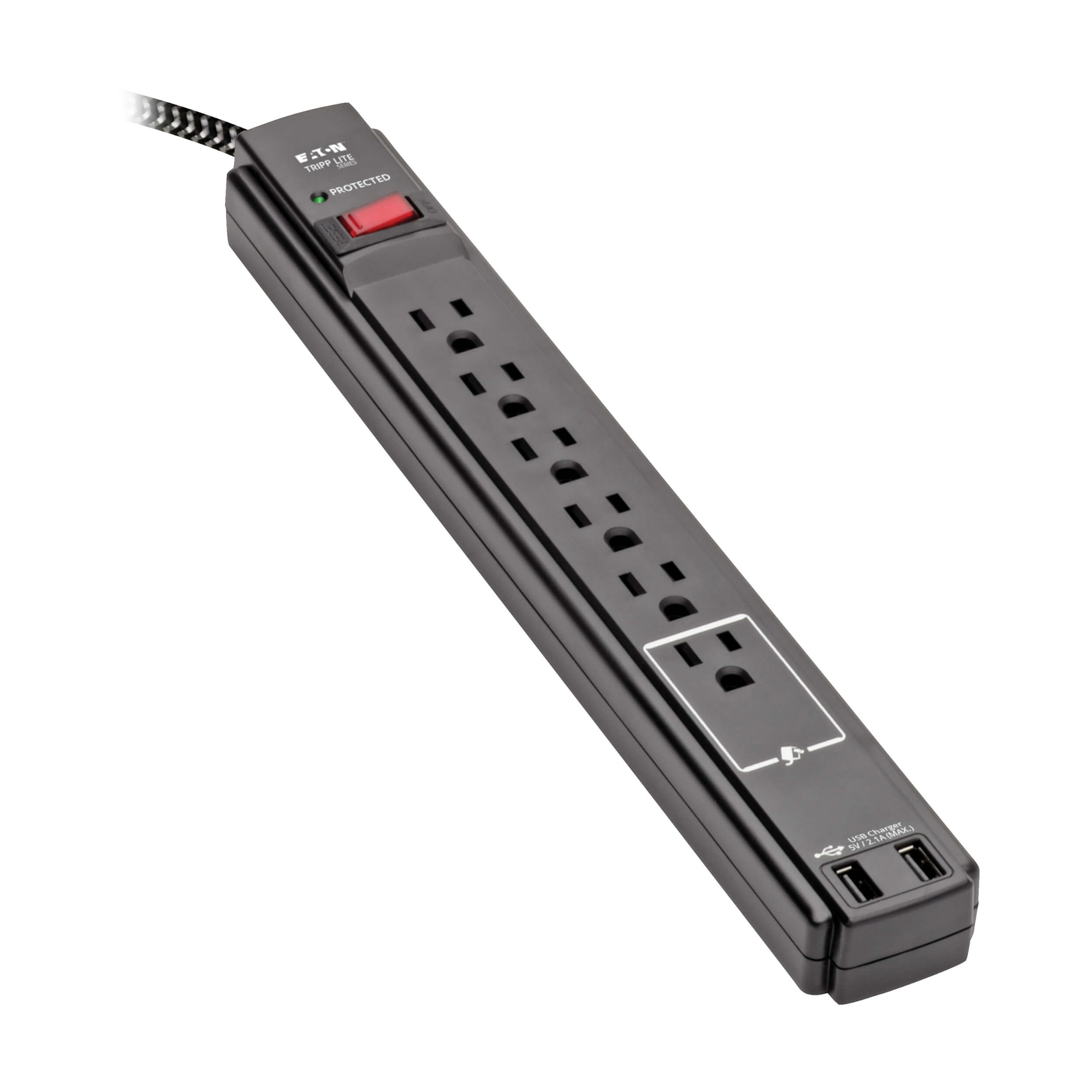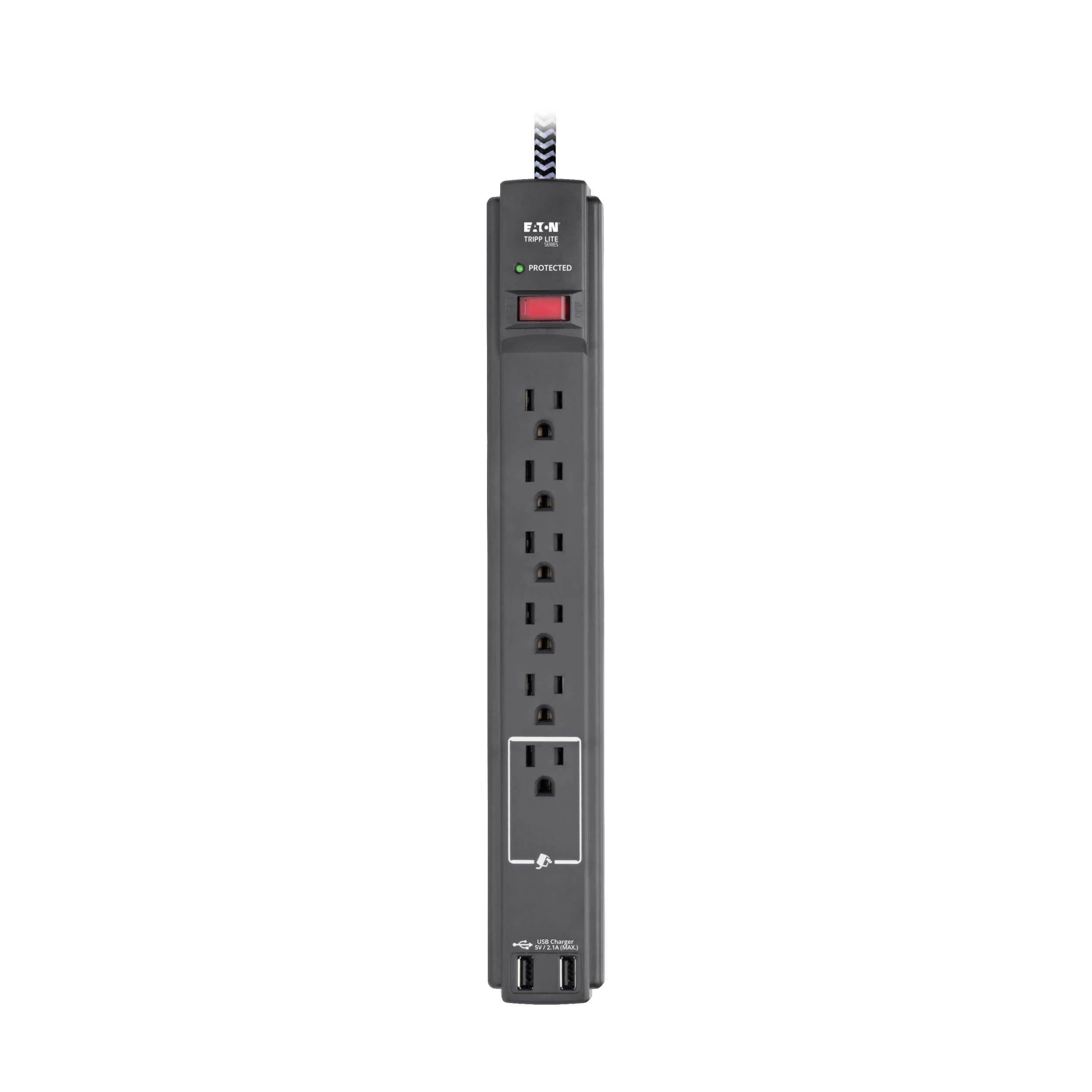 This surge protector with 10-foot (3-meter) braided AC input cord and NEMA 5-15P plug gives you flexibility in placing the unit away from the nearest wall outlet.