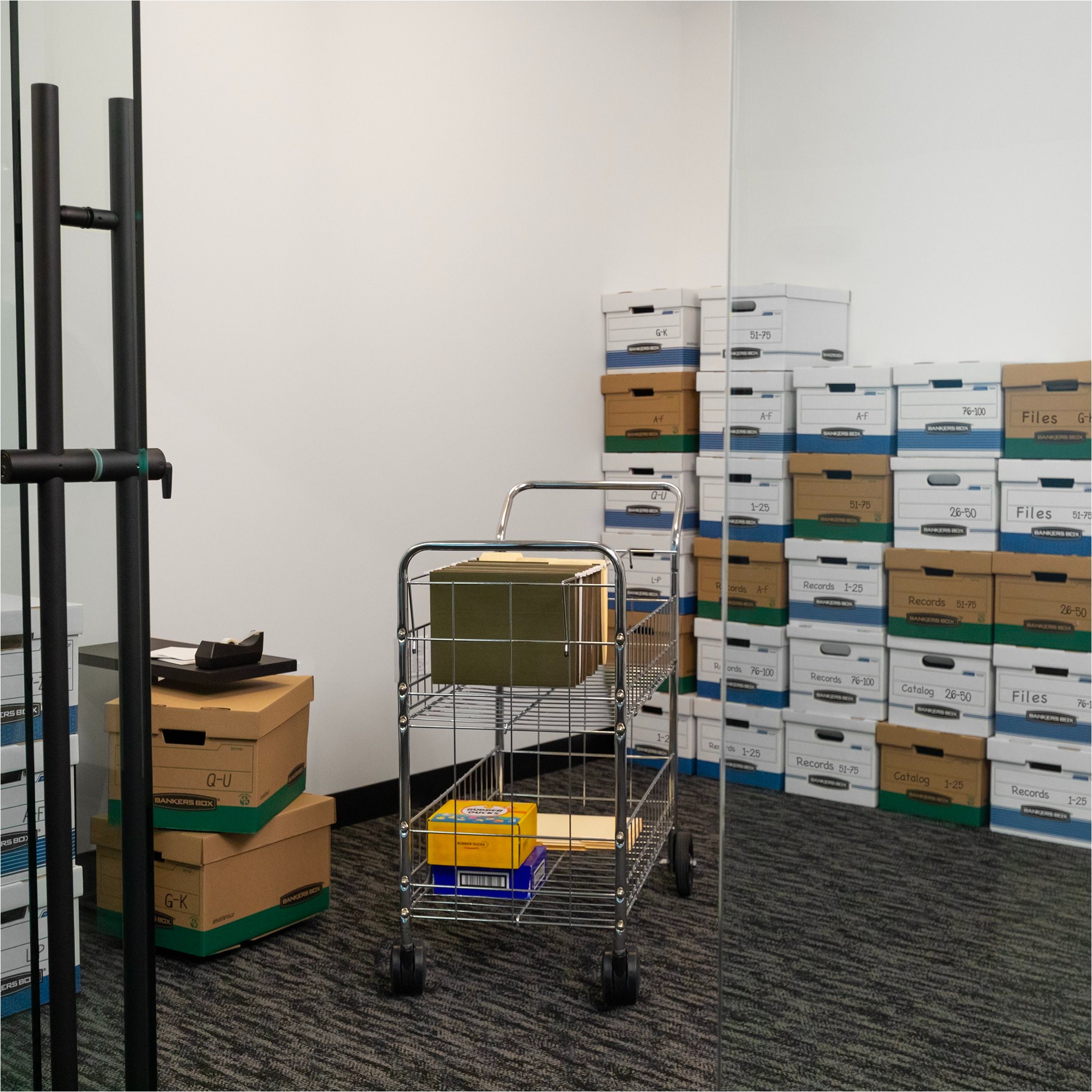 Top basket with adjustable guides holds up to 150 letter or legal files