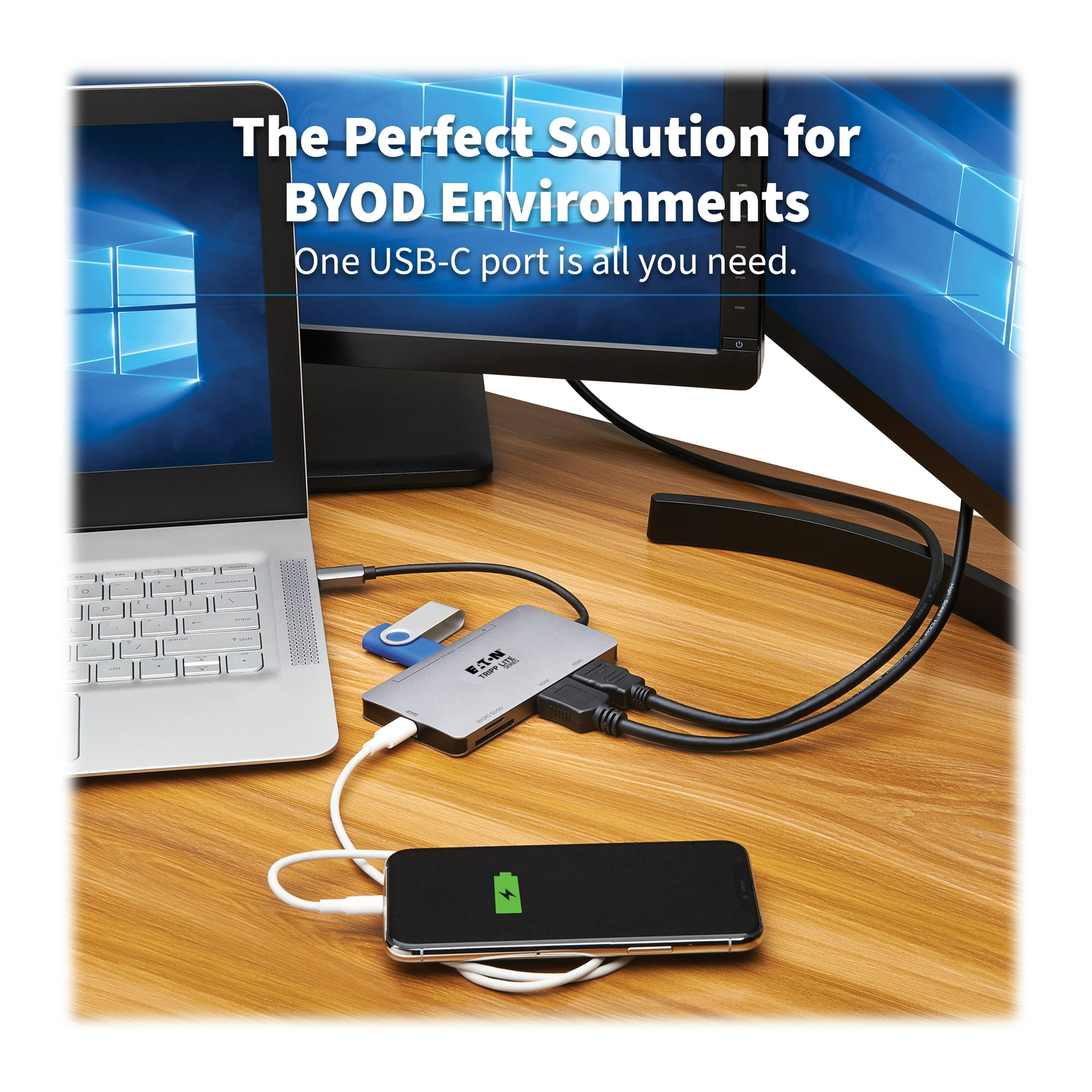 This USB-C dock with PD Charging expands the potential of your Windows laptop, Chromebook, smartphone or PC’s USB-C or Thunderbolt 3 port. It’s ideal for transmitting 4K video and digital audio to two large displays, adding a thumb drive and other USB peripherals, and powering and charging a PD Charging-compliant mobile device, all at the same time.