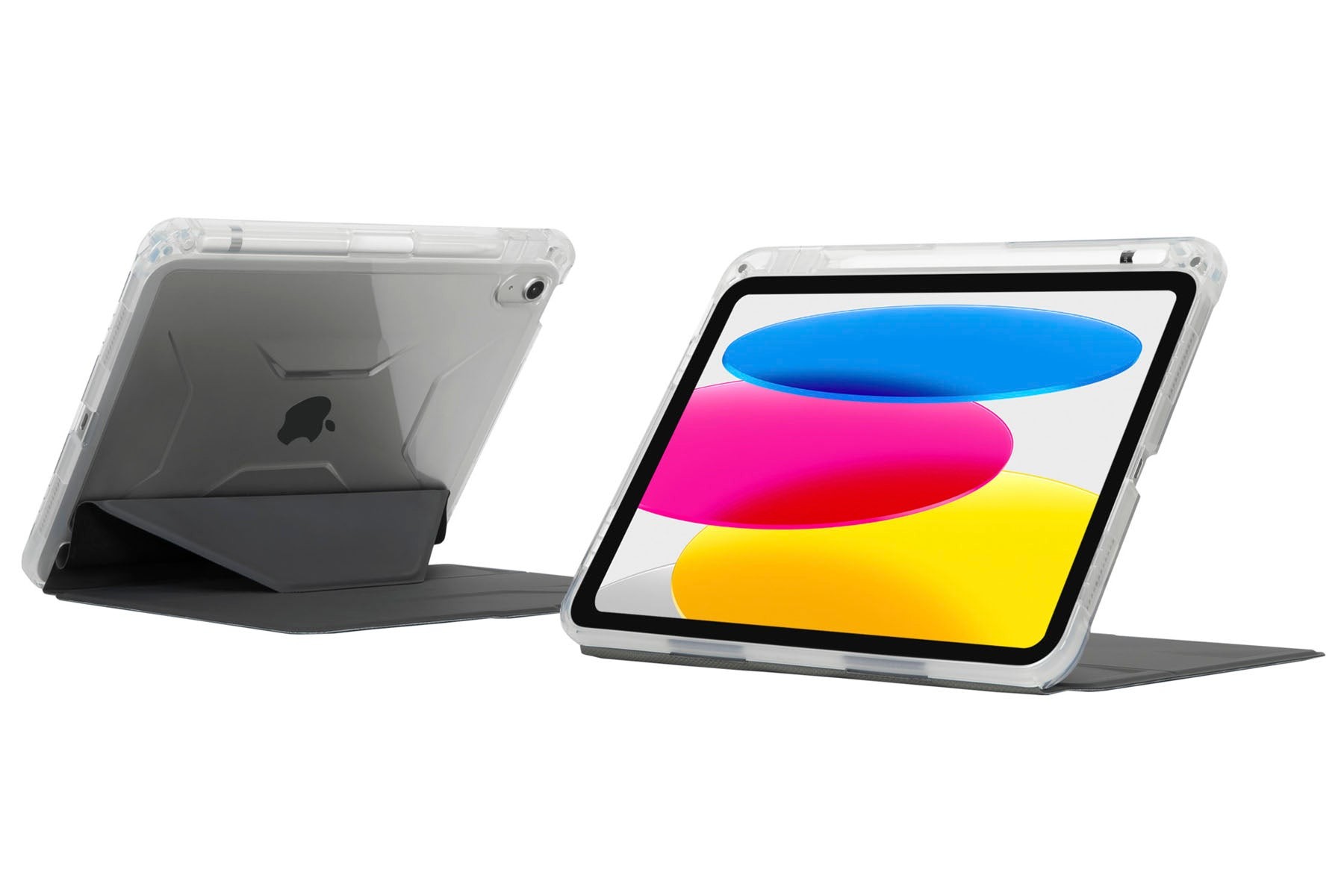 iPad (A16) and iPad (10th Gen) 10.9-inch – a case engineered for protection. Featuring a shock-absorbent tray with wrap-around bezel, covered buttons, and reinforced corners, plus a protective folio cover, the case delivers military-grade drop protection (up to 4 feet/1.2 meters)* in its sleek, clear-back design.