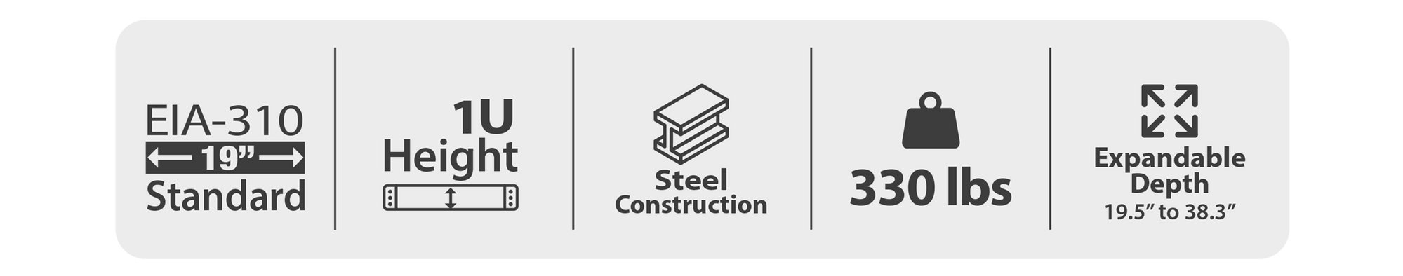The GRSH02 supports adjustable mounting depths between 19.5" to 38.3" for flexible configurations to optimize equipment storage