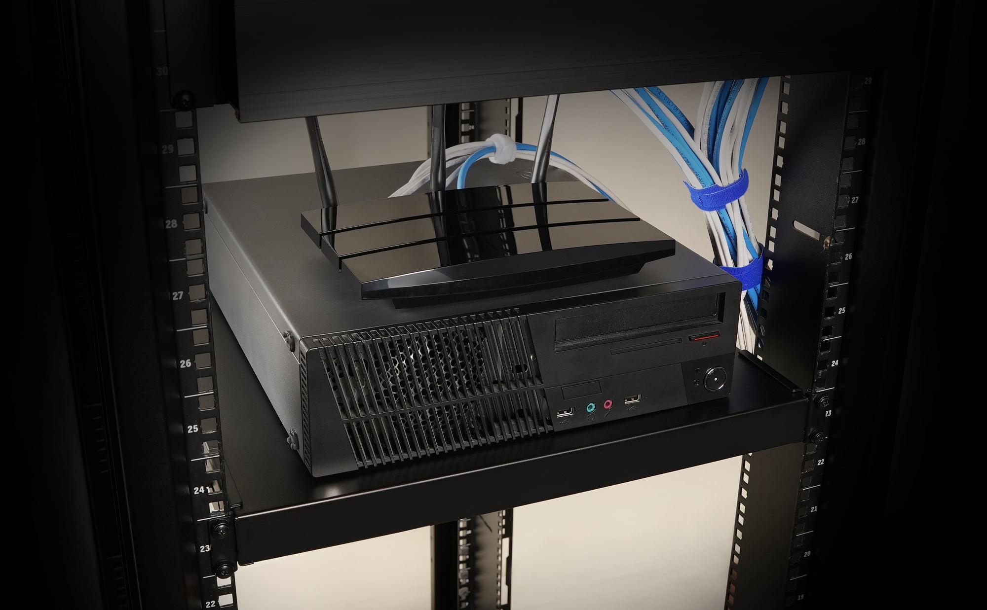 Maximize space and maintain an organized rack in diverse environments like data centers, where it can efficiently house small appliances and KVMs; studios, for securely placing audio interfaces and external hard drives; office server rooms, to organize modems and routers; or network closets, by supporting cable modems and wireless access points.
