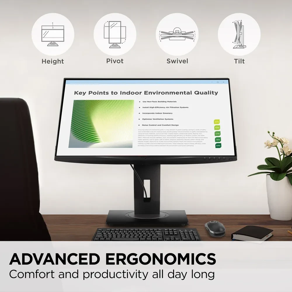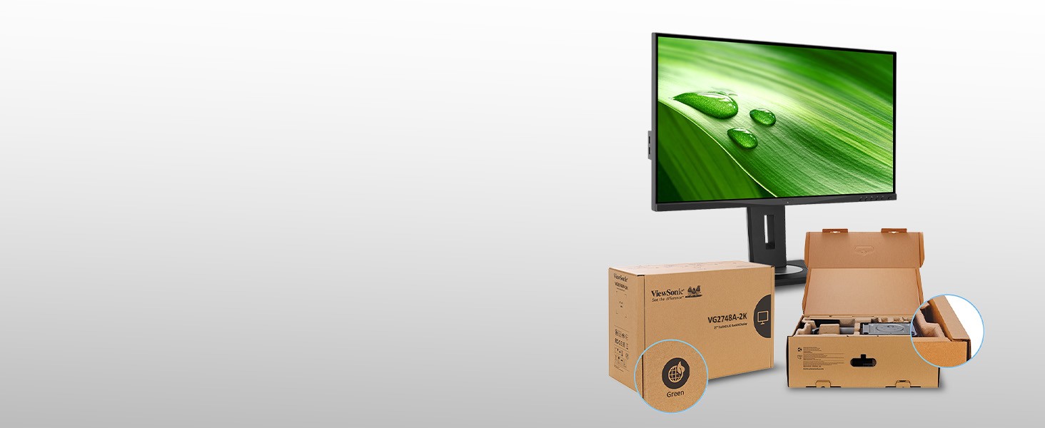 The ViewSonic® VG2748A-2K is a 27” QHD (2560 x 1440) monitor designed to enhance comfort, productivity, and peace of mind throughout your workday. Advanced sensing technology automatically adjusts screen brightness, supports better posture, and encourages healthy screen habits to promote long-term wellness. Privacy alerts help safeguard sensitive information, while energy-saving features reduce power consumption and support your sustainability goals. Built for modern workspaces, the VG2748A-2K includes ergonomic adjustments, a built-in USB hub, and versatile HDMI and DisplayPort inputs—all packaged with eco-conscious materials.