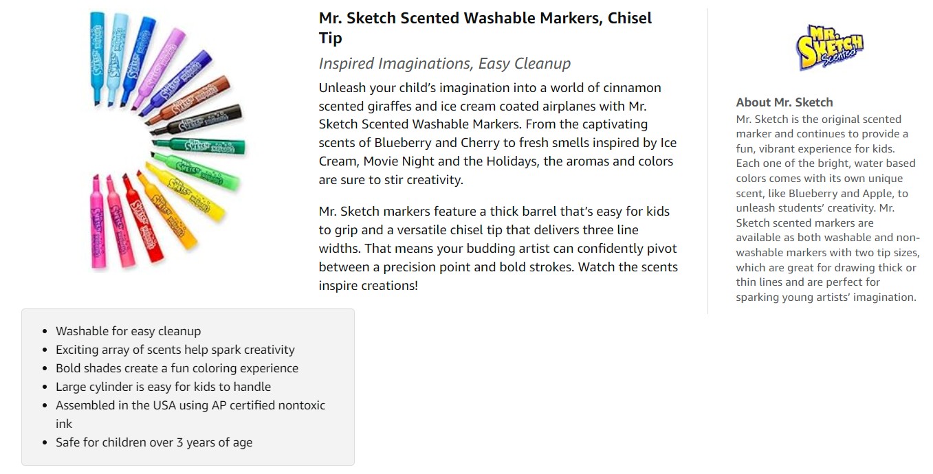 Mr. Sketch scented washable markers wash from skin and most washable children's clothing. Wash promptly for best results. Repeat washing may be required. Keep away from wallpaper, painted walls, finished and unfinished wood, vinyl, carpeting and other materials that cannot be laundered.