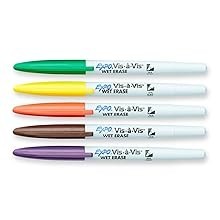 Expo Vis-à-Vis Wet-Erase Markers stay in place on transparencies, laminated cards, and whiteboards, so you can leave messages up for as long as you need, and then erase them with a damp cloth and start again.