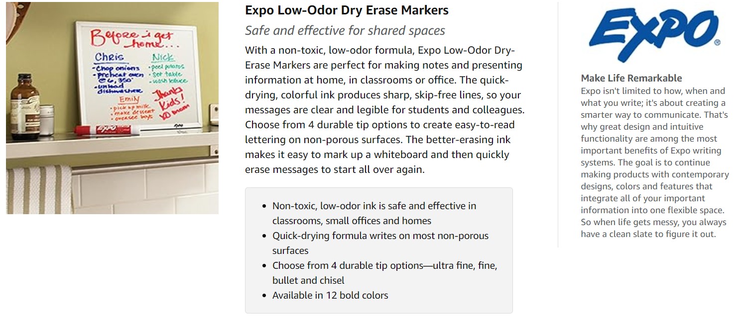 Expo Washable Dry-Erase Markers are easy to wash out of skin and most carpets and upholstery, so you and your little one can play or draw without making a mess in your home.