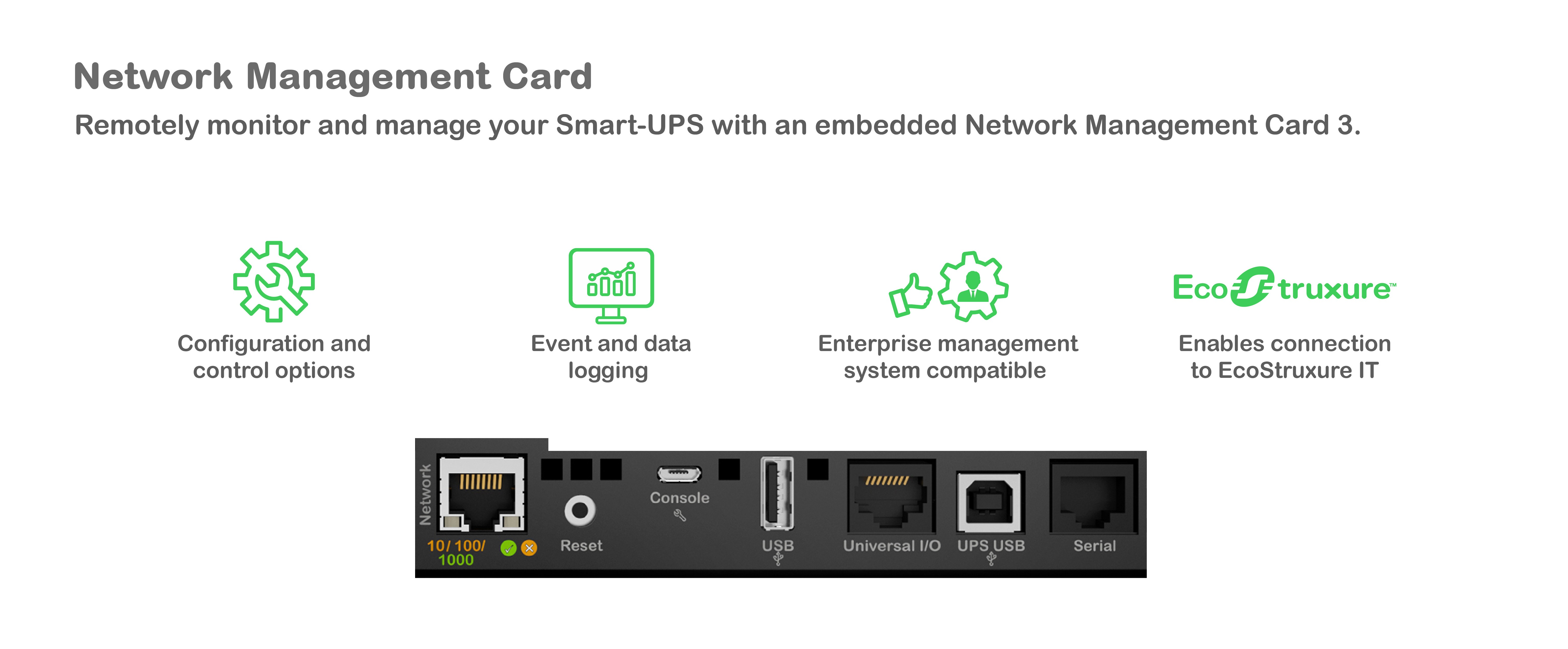 Options for monitoring and managing your UPS include EcoStruxure IT, Network Management Card, and PowerChute™ Network Shutdown Software.