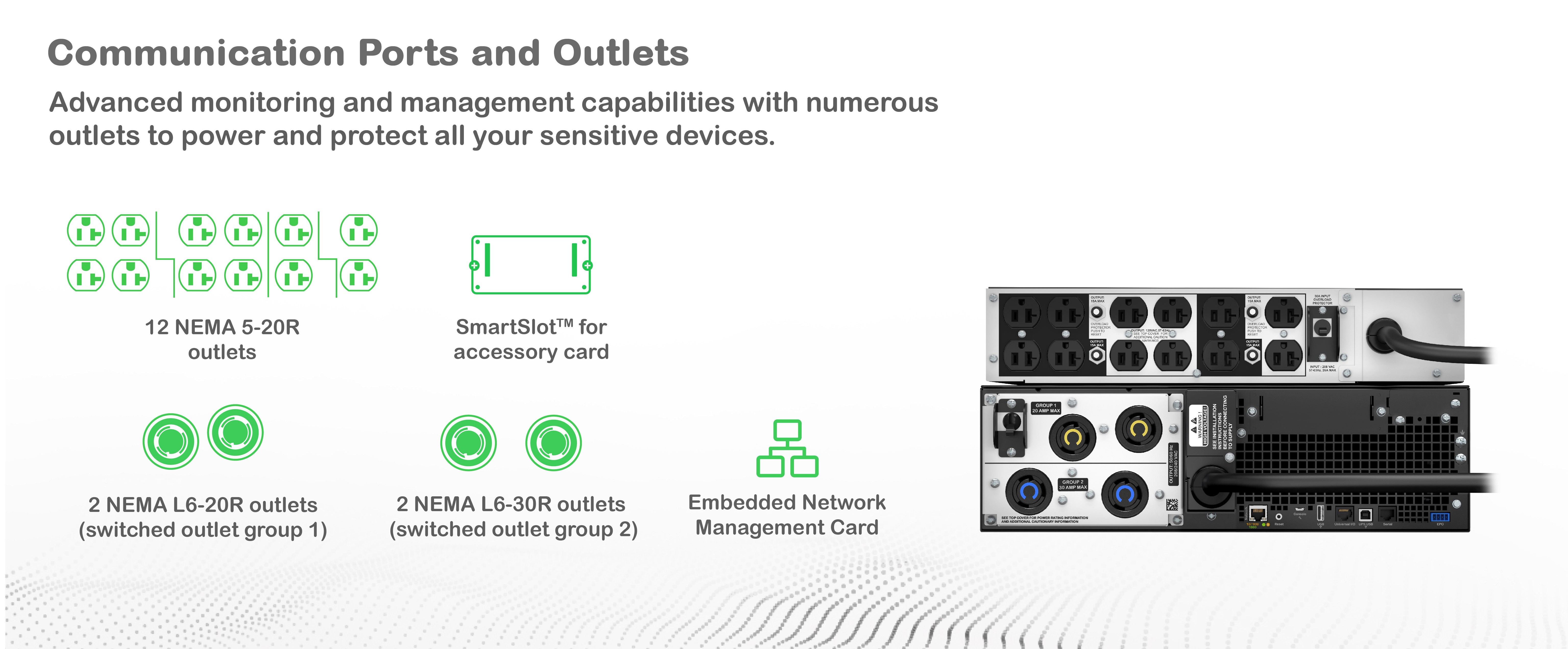 16 outlets in 5U (12) NEMA 5-20R, (2) NEMA L6-20R, (2) NEMA L6-30R , including 2 switched outlet groups |