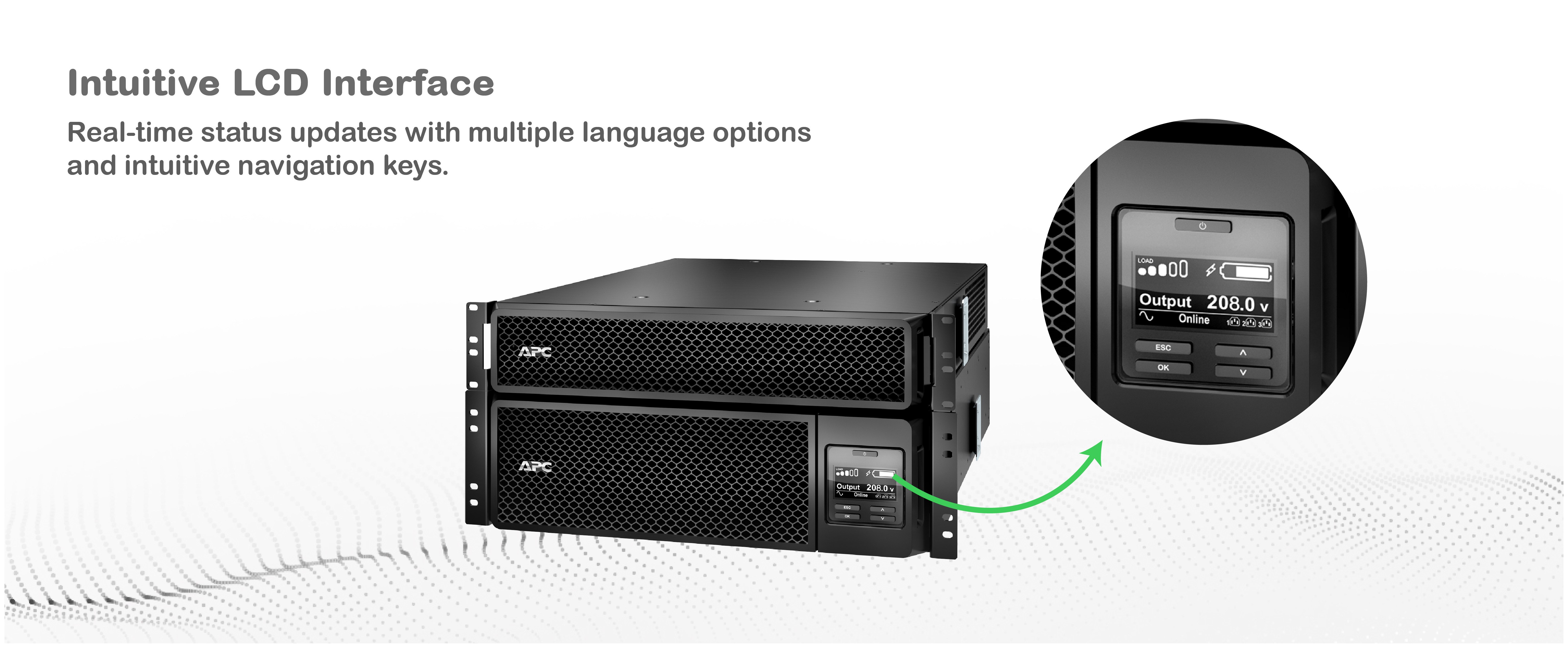 Graphical LCD display Quick, easy-to-read, intuitive LCD provides information about the utility and UPS conditions. |