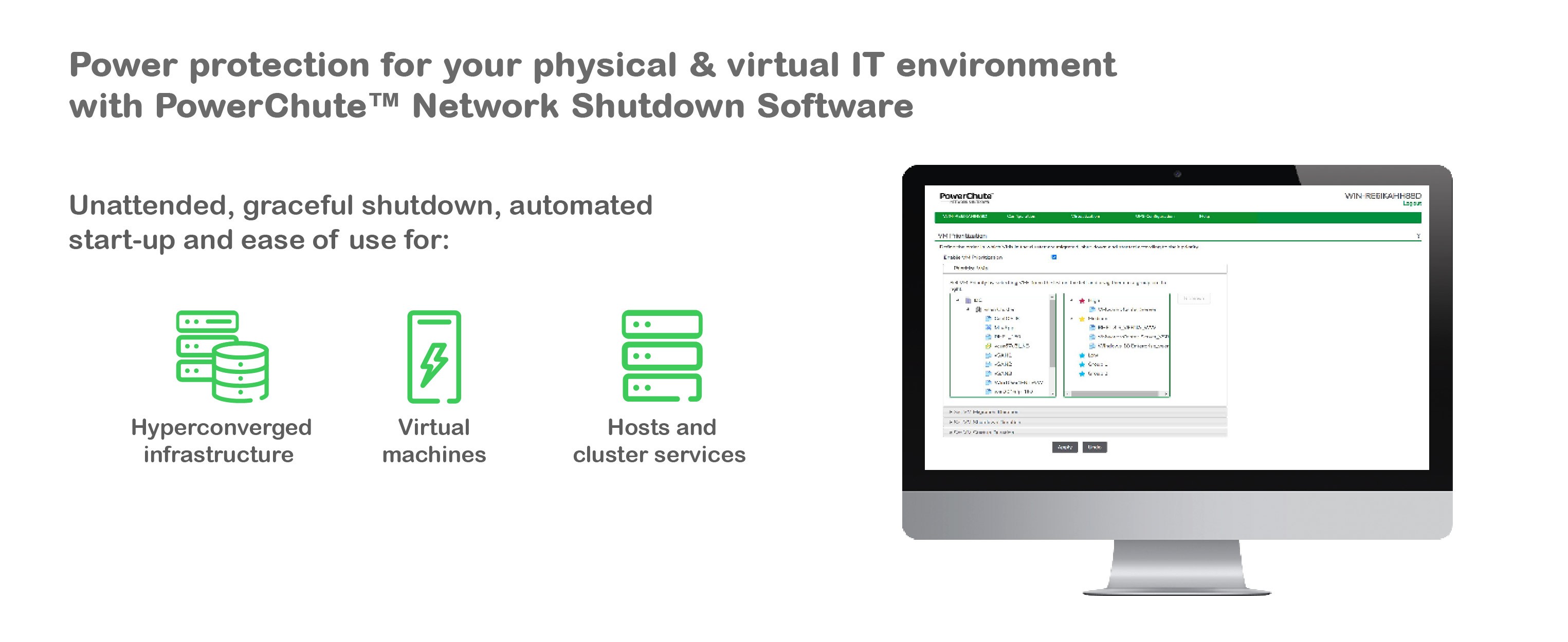 PowerChute Network Shutdown v5.0 supports vSphere Cluster Services (vCLS). Ongoing software update support for the latest virtualization environment updates & troubleshooting. Latest cybersecurity updates in PKI support to harden security across the interfaces. Validated integrations with the latest virtual and HCI infrastructure versions for ease of deployment. PowerChute can be fully deployed within the VxRail cluster through the Dell VxRail API Integration (From v4.5), saving space and reducing hardware needs. VxRail cluster shutdown redundancy is provided with the Network Management Card 3.