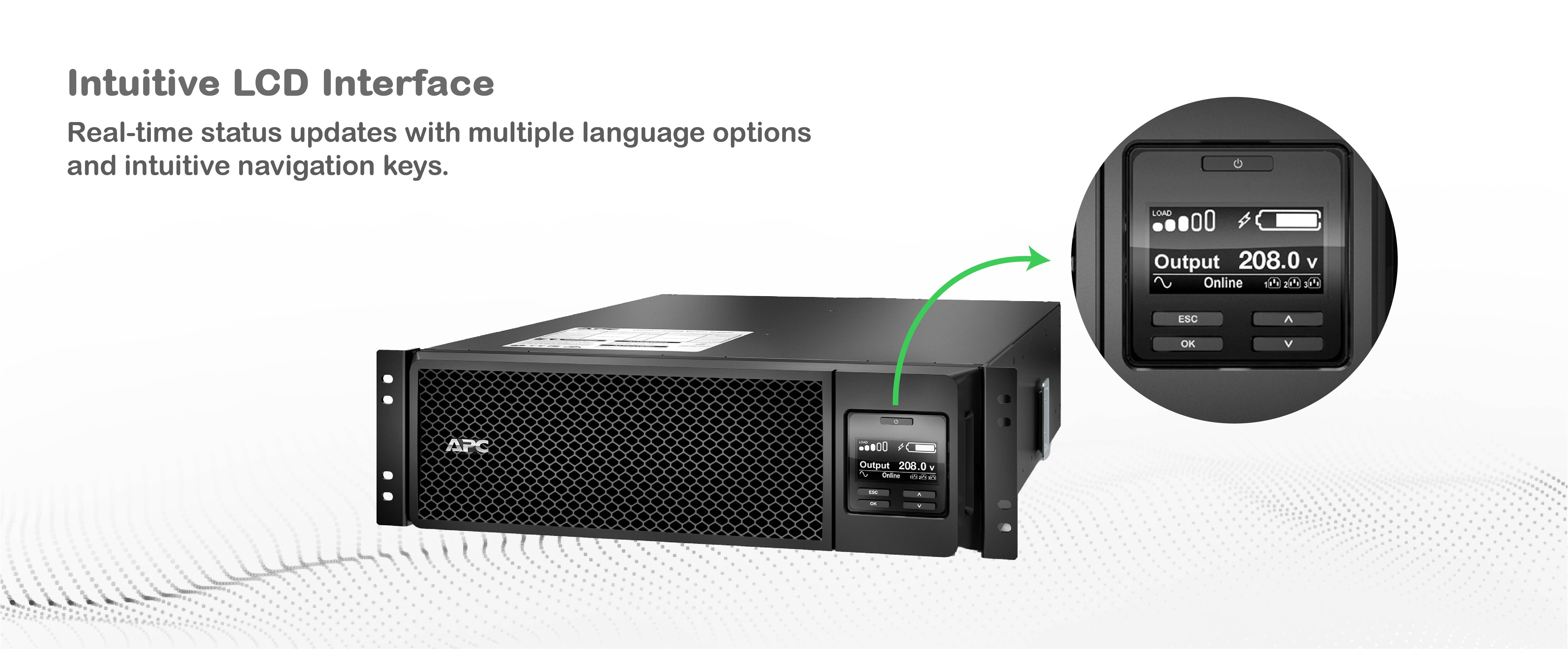 Graphical LCD display Quick, easy-to-read, intuitive LCD provides information about the utility and UPS conditions. |