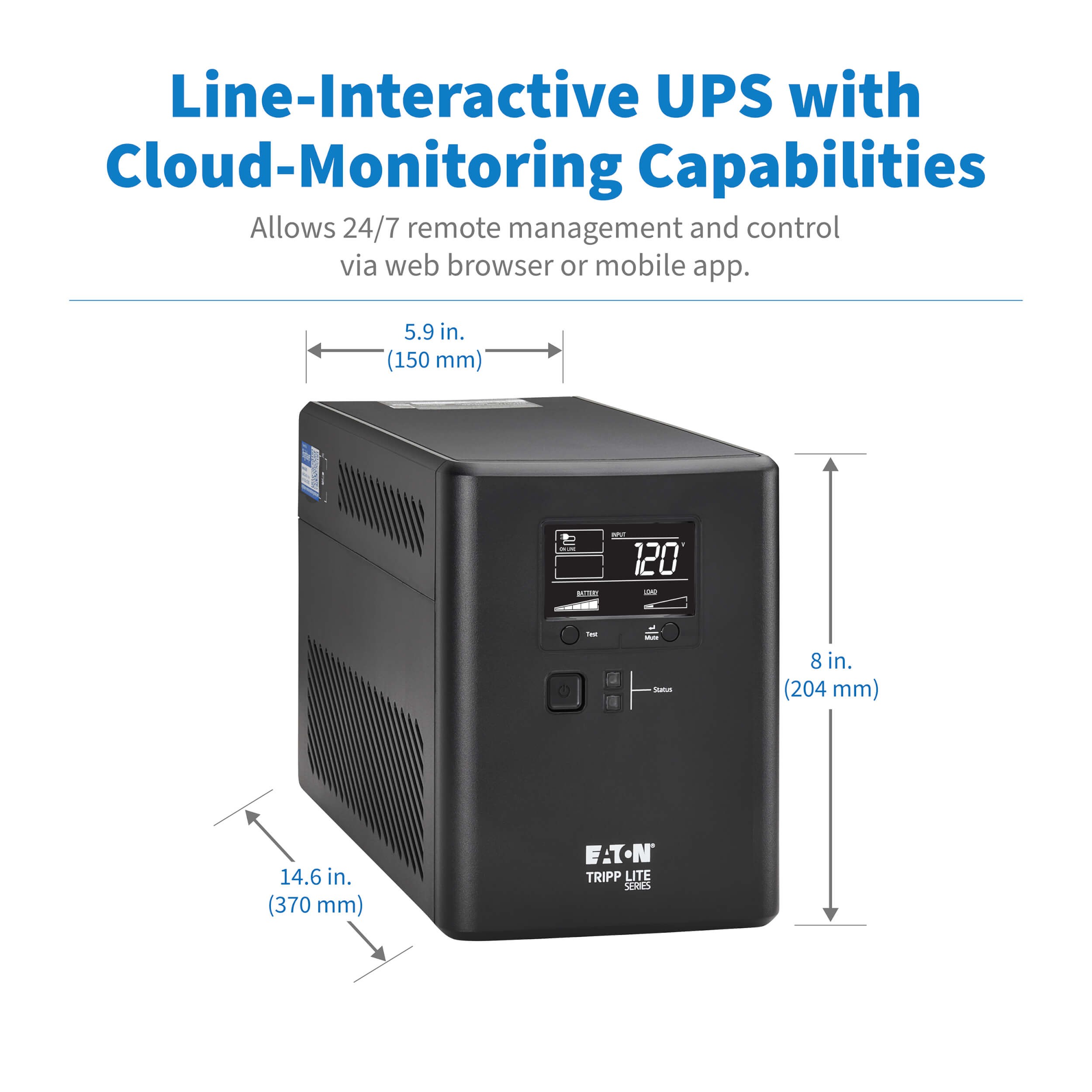 The SMART1500LCDTXC Line-Interactive cloud-connected UPS system regulates incoming voltage and provides reliable battery backup and AC power protection against blackouts, brownouts, overvoltages, surges, and Line noise. Its compact tower form factor is suitable for desktop, floor placement, under workstations and other locations where a taller “Rack/Tower” unit may not fit. It’s recommended for Home/office, Point-of-sale workstations, digital signage equipment, and gaming equipment.