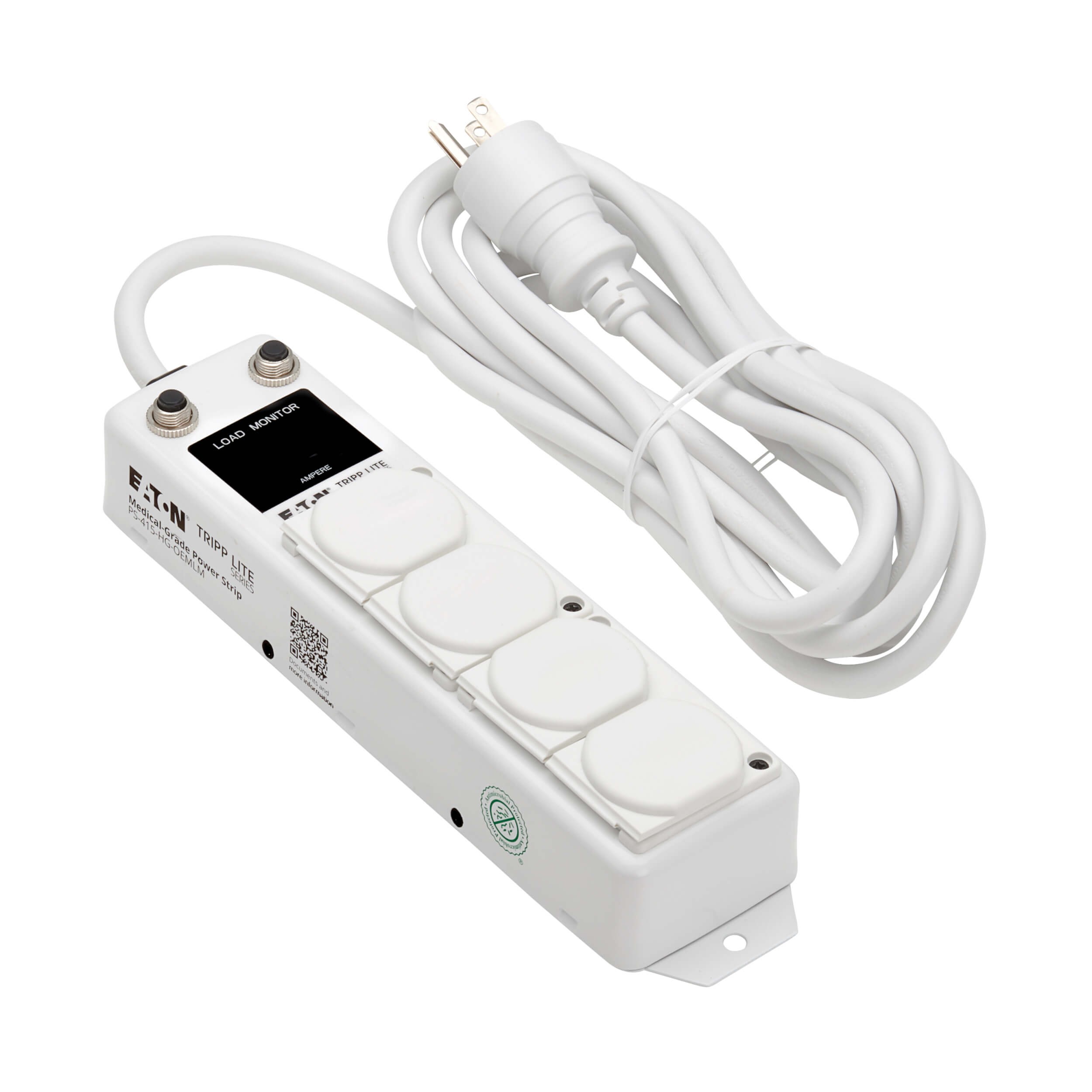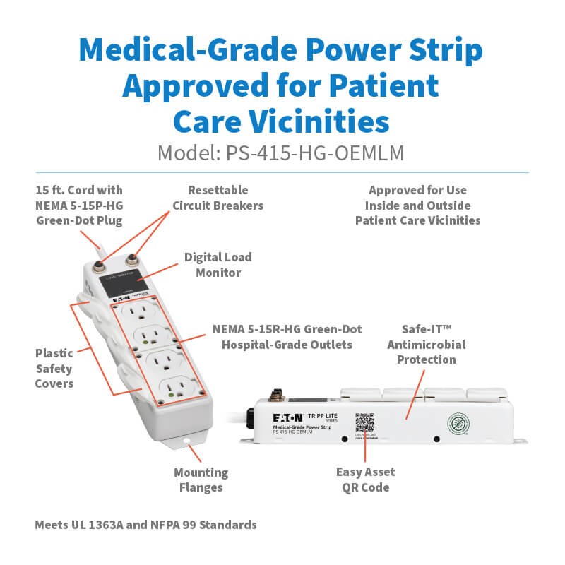 The PS-415-HG-OEMLM features four NEMA 5-15R-HG “green dot” hospital-grade outlets that supply power to equipment mounted to IV poles, mobile carts, crash carts and mobile medical workstations inside and outside patient care vicinities. Compliant with UL 1363A specifications, this power strip can be used in patient rooms, operating rooms, therapy rooms, dialysis rooms, labs, and assisted living and home health environments.