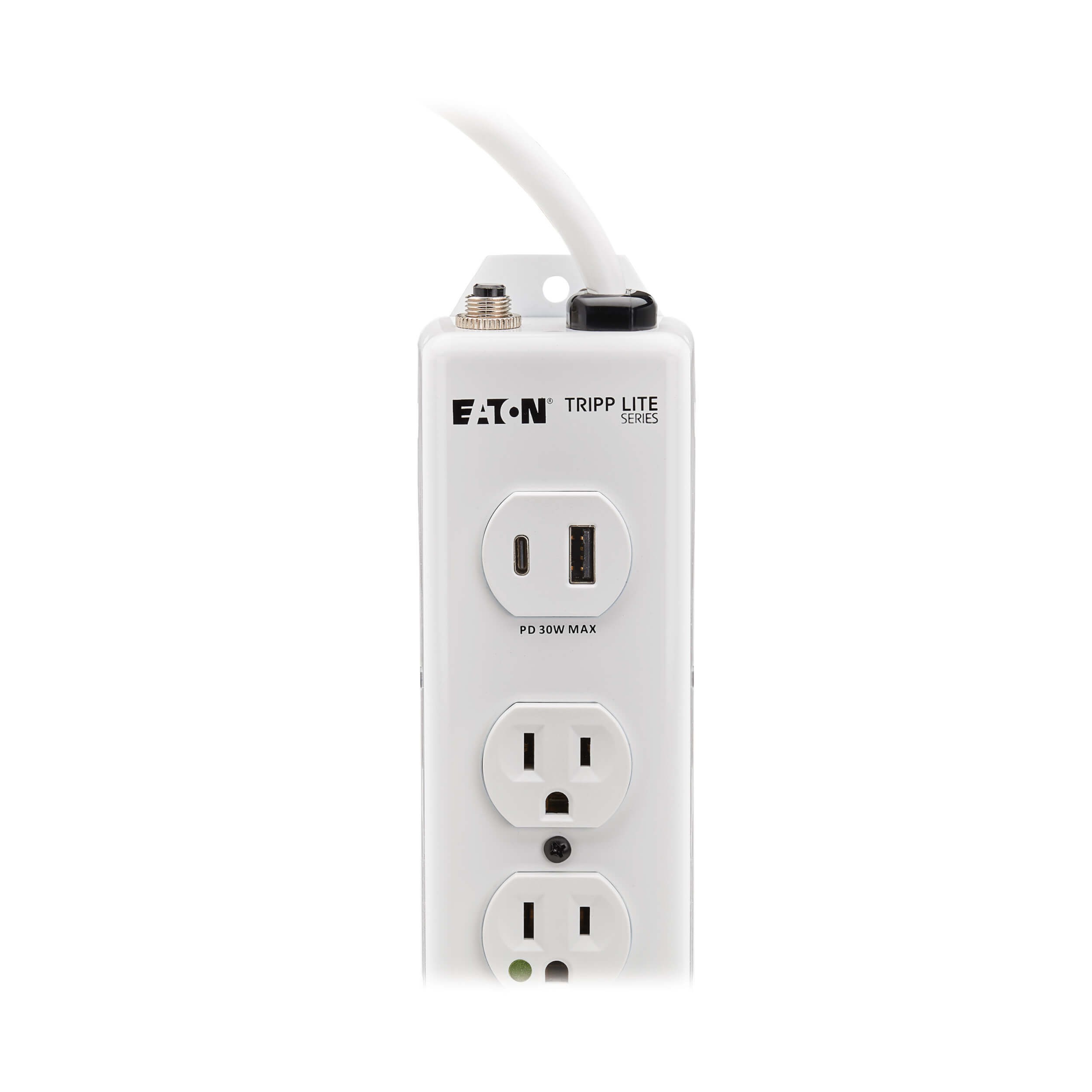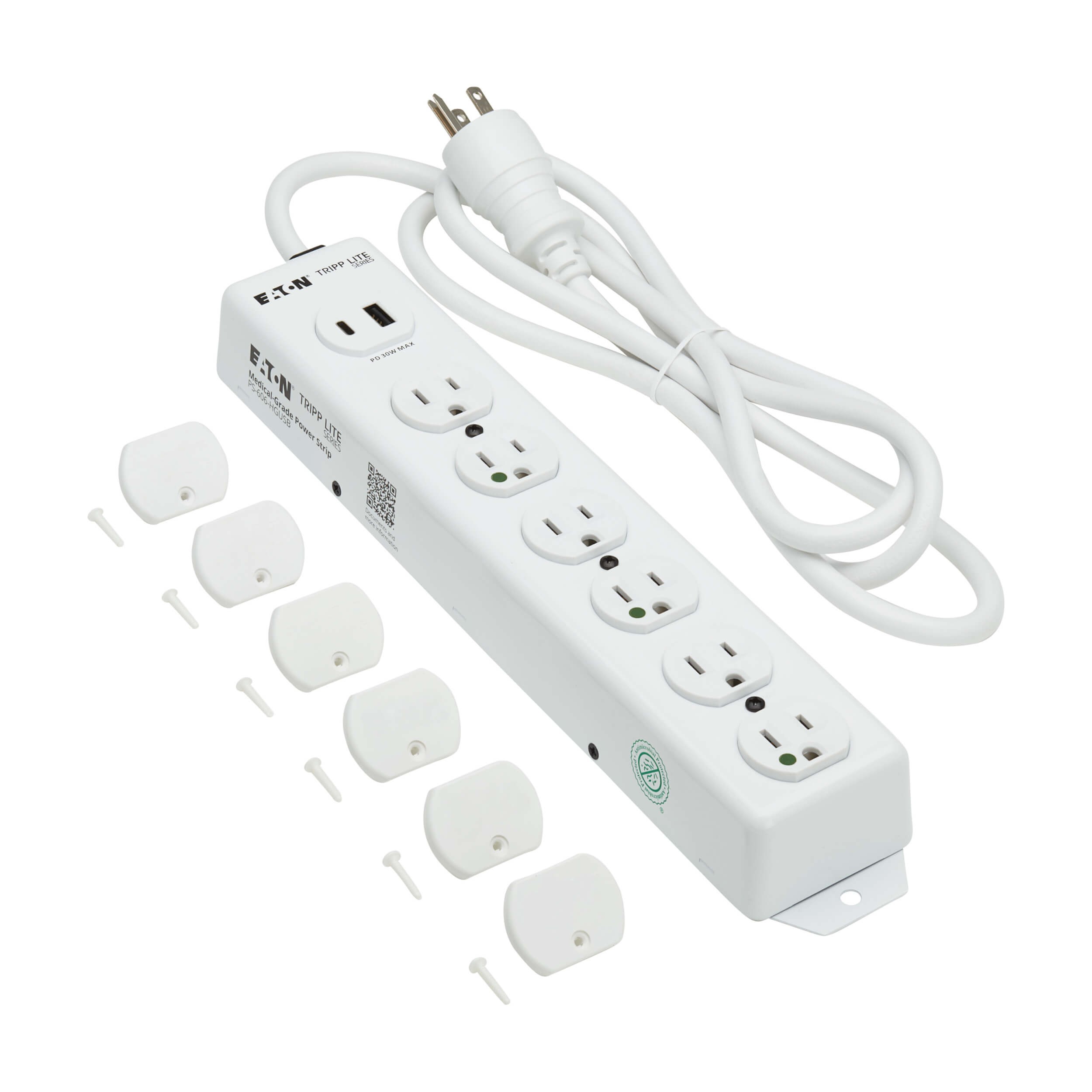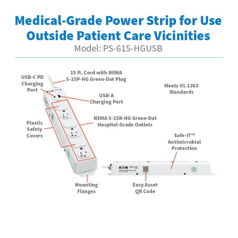 The PS-615-HGUSB features six NEMA 5-15R-HG hospital-grade outlets that supply power to equipment used in areas outside patient care vicinities, including nursing stations, pharmacies, office and administration areas, and labs. This power strip has a NEMA 5-15P-HG “green dot” plug and meets UL 1363 standards.