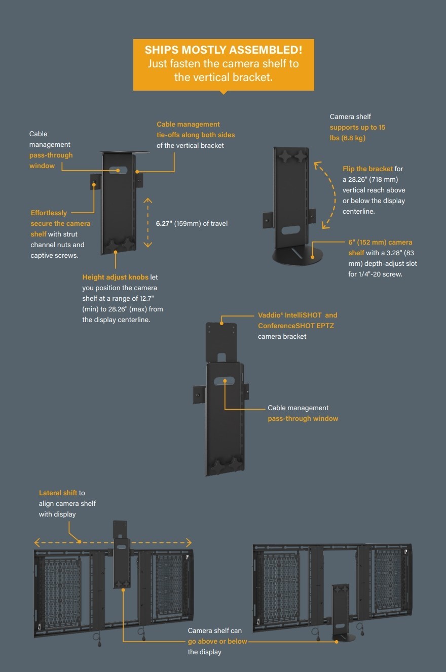 Quick and easy installation. The camera shelf glides and locks into place on the top or bottom rail of the Tempo Flat Panel Wall Mount System using strut channel nuts with captive screws.