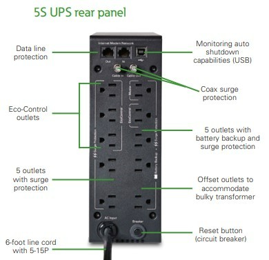 The 5S manages your energy efficiency for you with EcoControl Master/Control outlets. When the item using the Master outlet (e.g., your computer) is idle or shut down, then items using the Control outlets (e.g., printer, scanner, fax) are automatically powered down — rewarding you with up to 30 percent in energy savings over a typical battery backup.