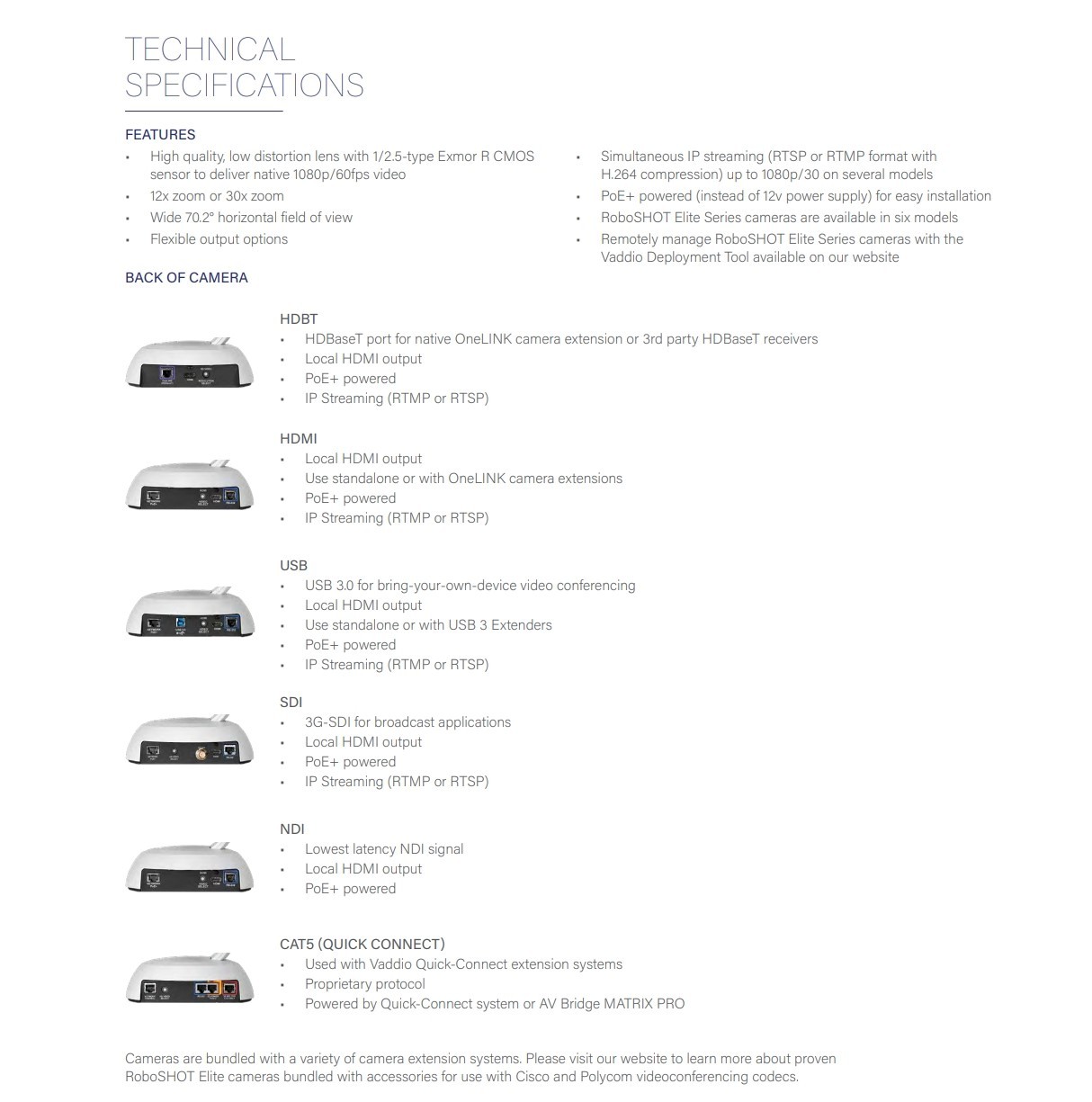 Introducing the RoboSHOT Elite Series - Vaddio's next generation of professional cameras. Designed with an 1/2.5-type Exmor R CMOS sensor, RoboSHOT Elite cameras deliver striking, high-definition video image quality. Cutting-edge image signal processing (ISP) results in better light-gathering capabilities, incredible contrast and sharp 1080p/60 video, even in dim lighting conditions.