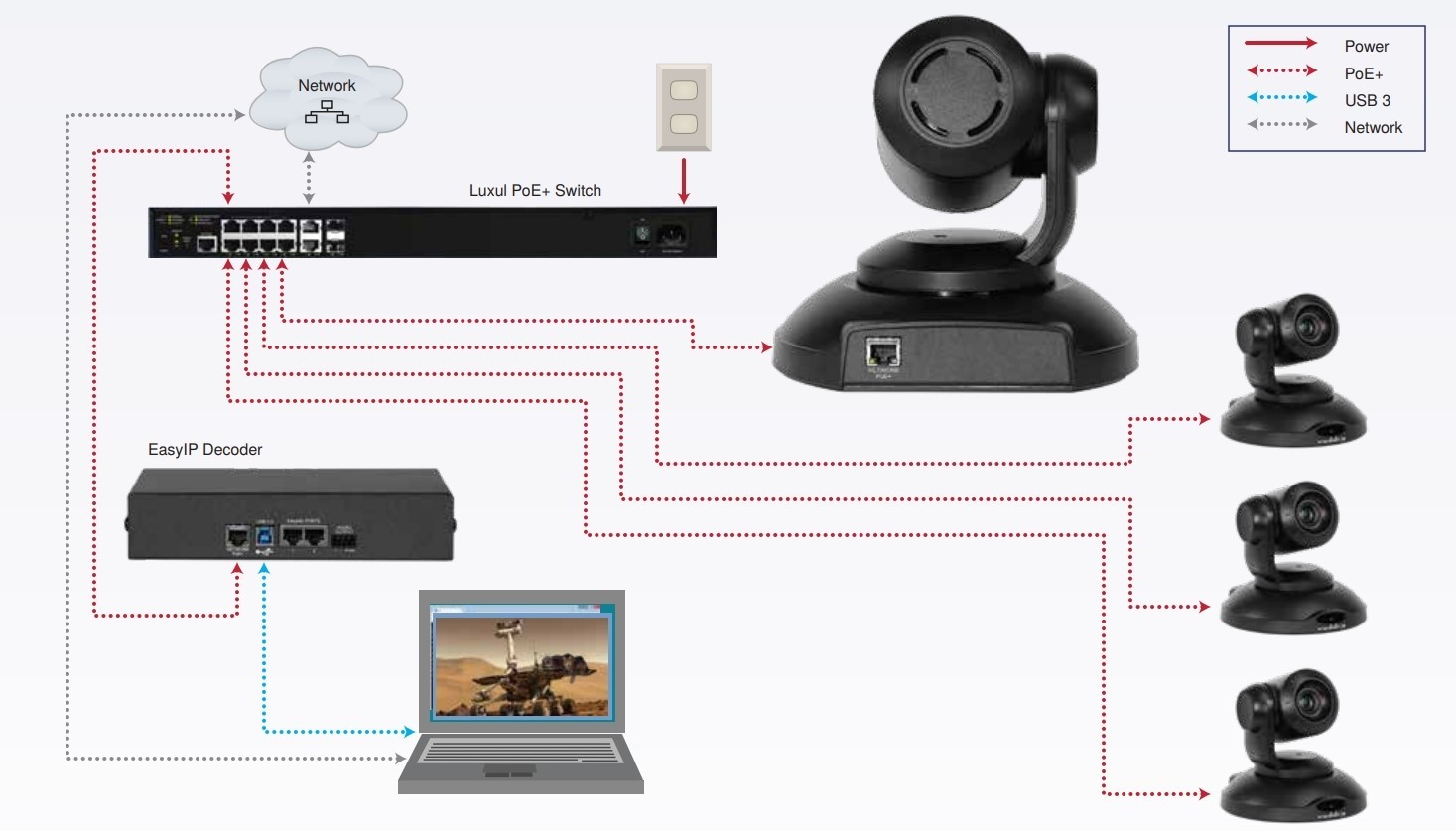 The EasyIP 10 Camera sends 1080p/60 resolution feeds to the EasyIP Ecosystem for delivery to web-based conferencing solutions and connects to a 1 Gb PoE+ switch - eliminating the needs for costly USB extensions.