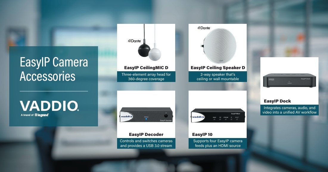 The EasyIP 10 Mixer Base Kit is an AV-over-IP classroom system in a box. Ideal for large classrooms and multi-camera applications, the EasyIP Mixer combines Dante audio sources and four Vaddio EasyIP cameras to deliver the easiest production system.