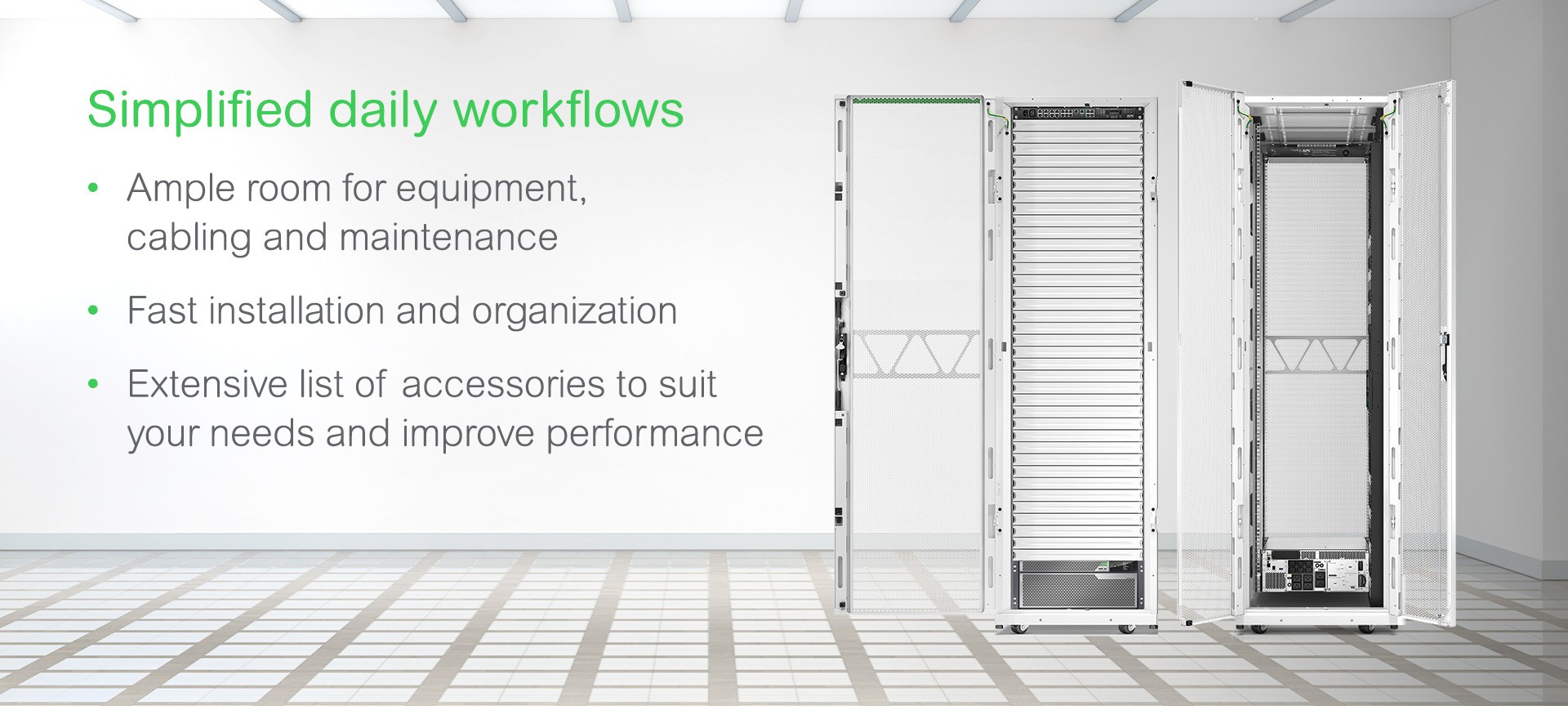 With the help of a sales representative, you can design your own EcoStruxure Micro Data Center or EcoStruxure Row Data Center using NetShelter SX Enclosures. For example, add APC products and Schneider Electric services, such as APC Smart-UPSTM Modular Ultra, NetBotz security and environmental monitoring, NetShelter intelligent rack PDUs and EcoStruxure IT remote monitoring software. Pair with NetShelter Aisle Containment for optimized air cooling.