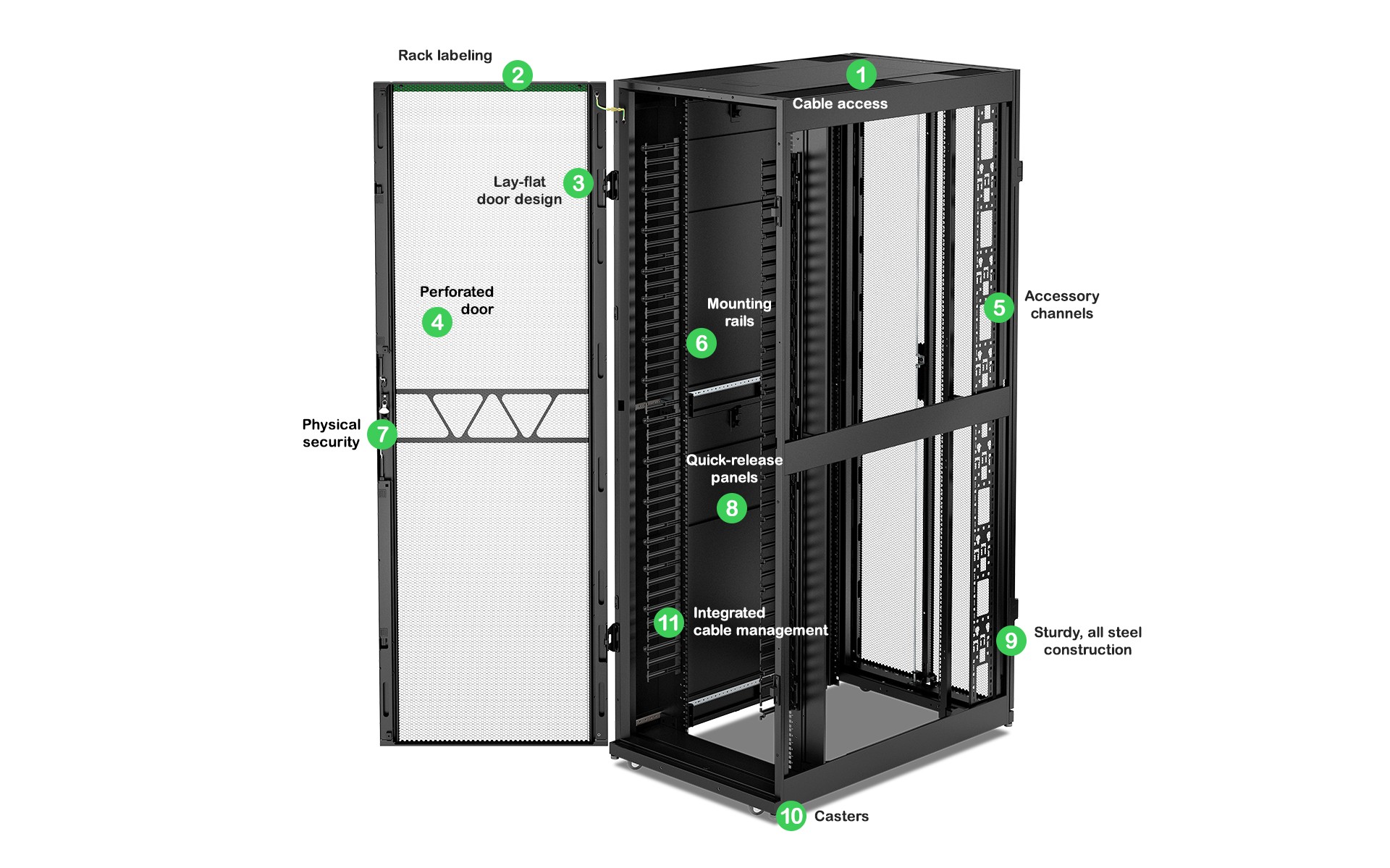 9) Sturdy, all-steel construction: Handles higher weight loads than previous model, allowing for more IT equipment in each rack.