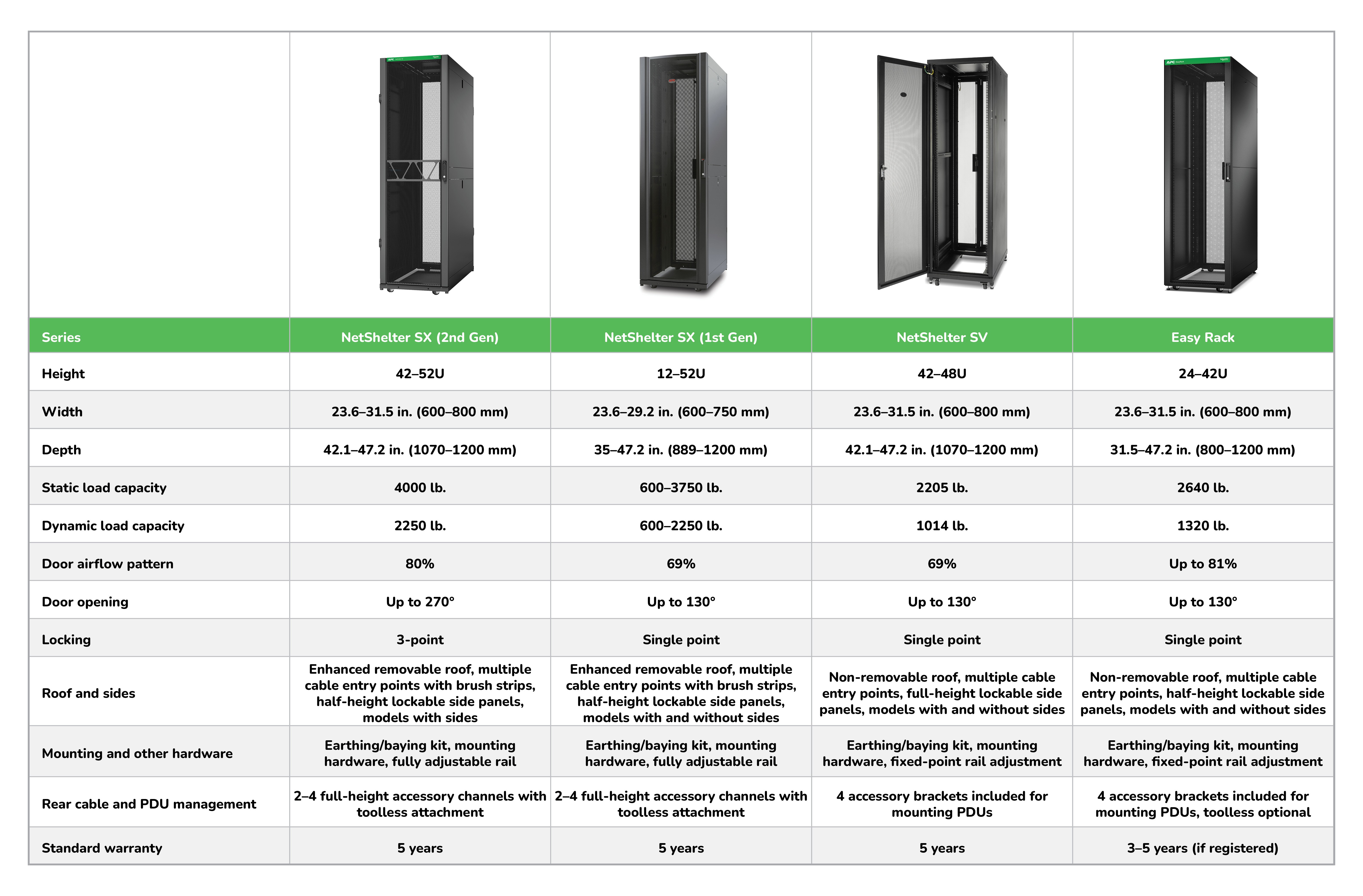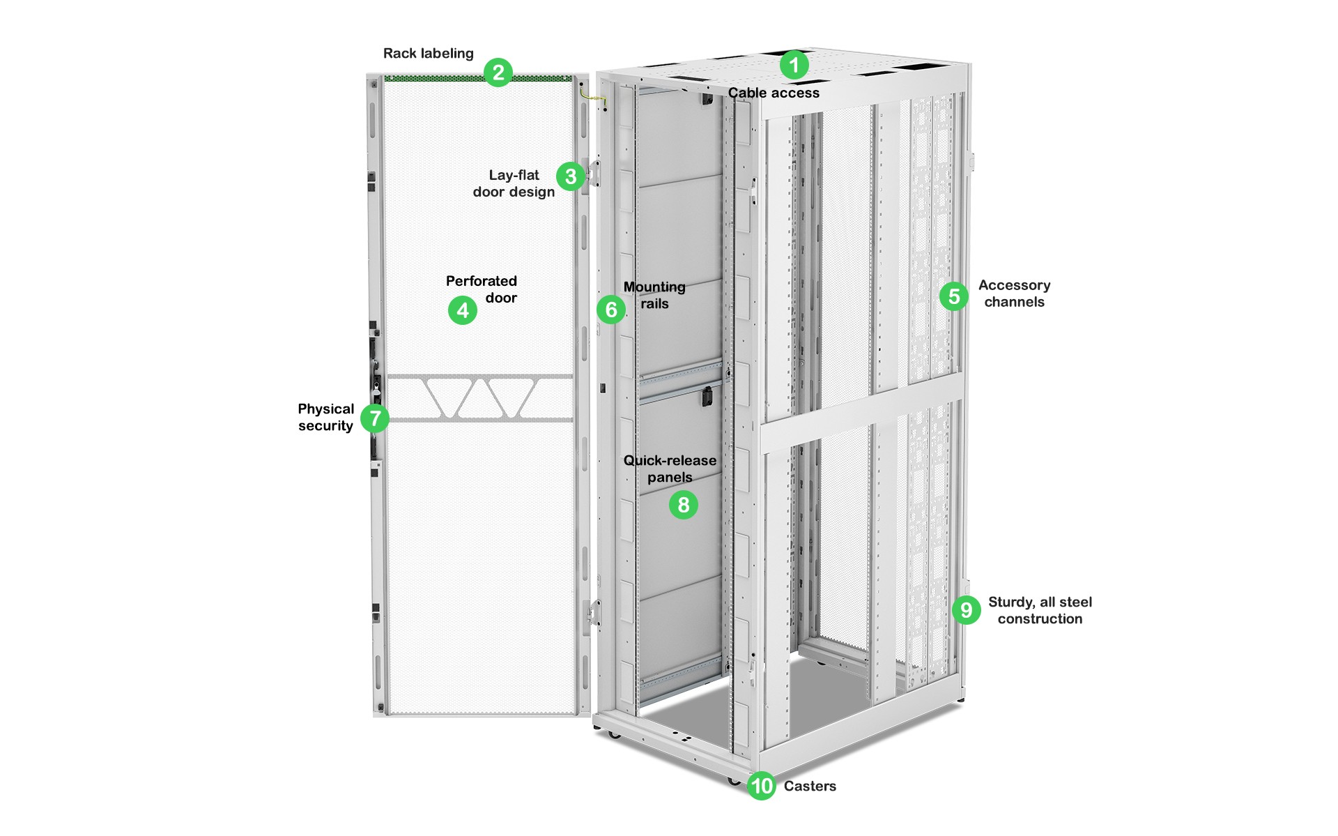 9) Sturdy, all-steel construction: Handles higher weight loads than previous model, allowing for more IT equipment in each rack.