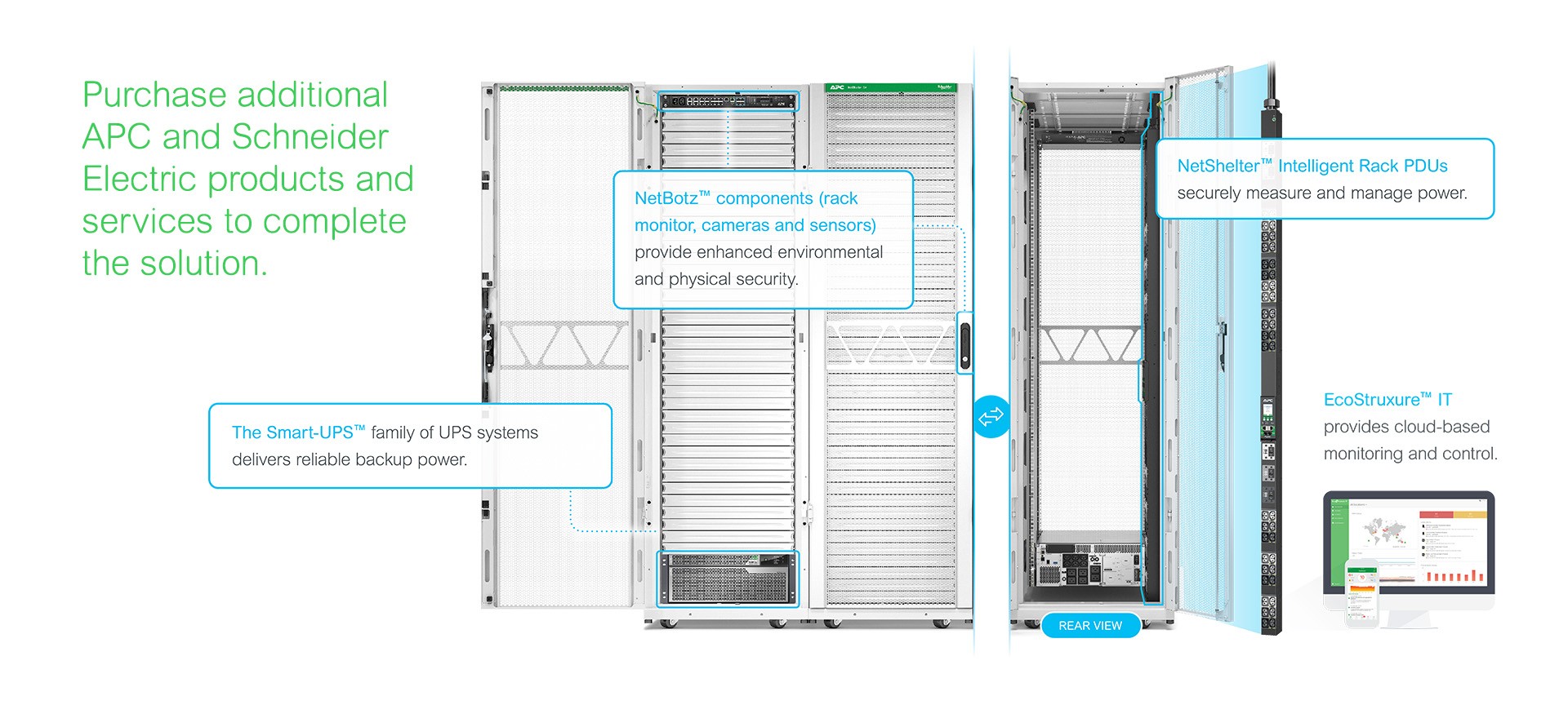 With the help of a sales representative, you can design your own EcoStruxure Micro Data Center or EcoStruxure Row Data Center using NetShelter SX Enclosures. For example, add APC products and Schneider Electric services, such as APC Smart-UPSTM Modular Ultra, NetBotz security and environmental monitoring, NetShelter intelligent rack PDUs and EcoStruxure IT remote monitoring software. Pair with NetShelter Aisle Containment for optimized air cooling.