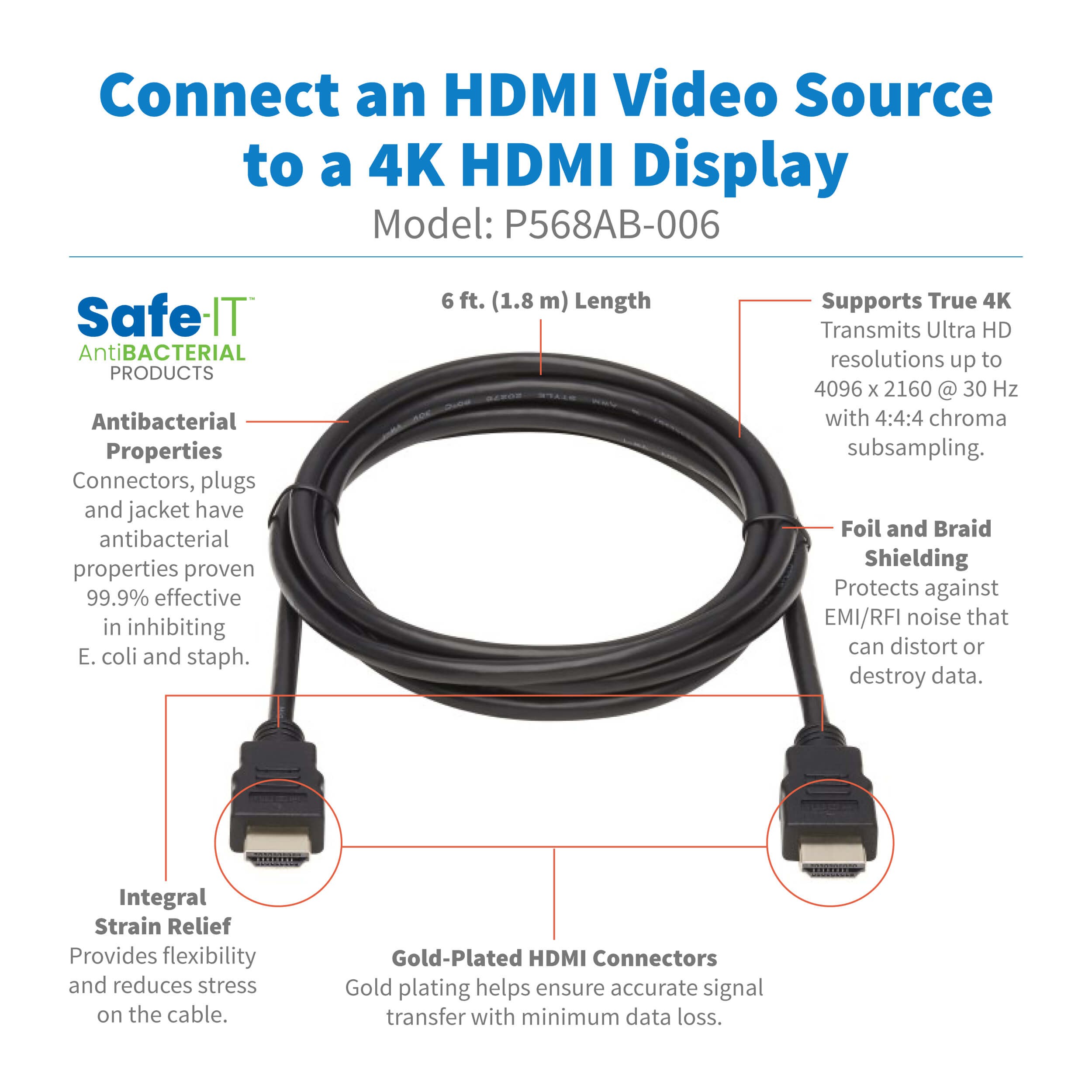 This high-speed HDMI cable securely connects laptops, tablets, PCs, Blu-ray players, game consoles, Roku/Apple TV boxes, satellite/cable TV receivers and other devices with HDMI outputs to HDTVs, HD monitors, projectors or home theater receivers with HDMI inputs. The 4K P568AB-006 is backward compatible with all your existing HDMI devices.